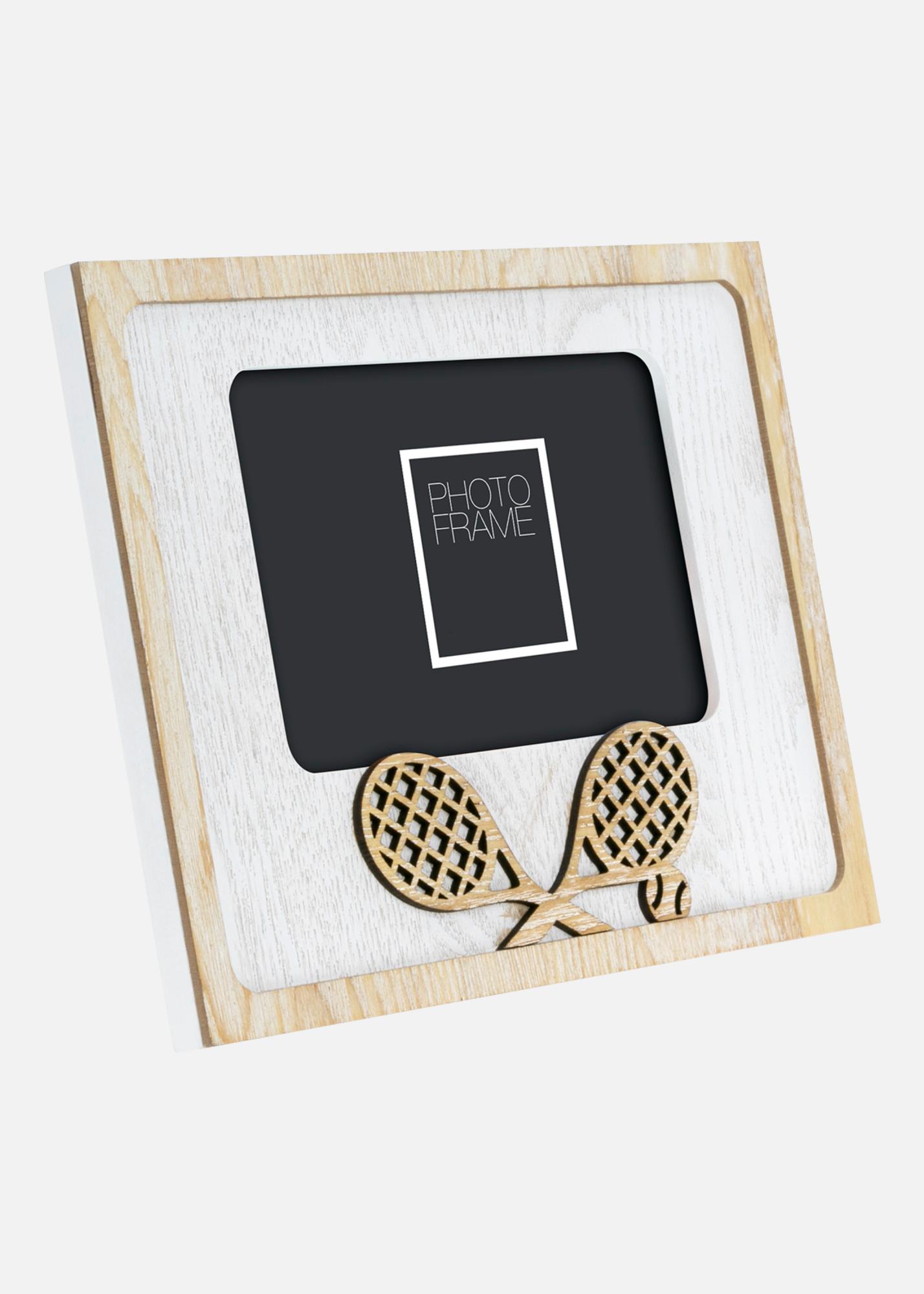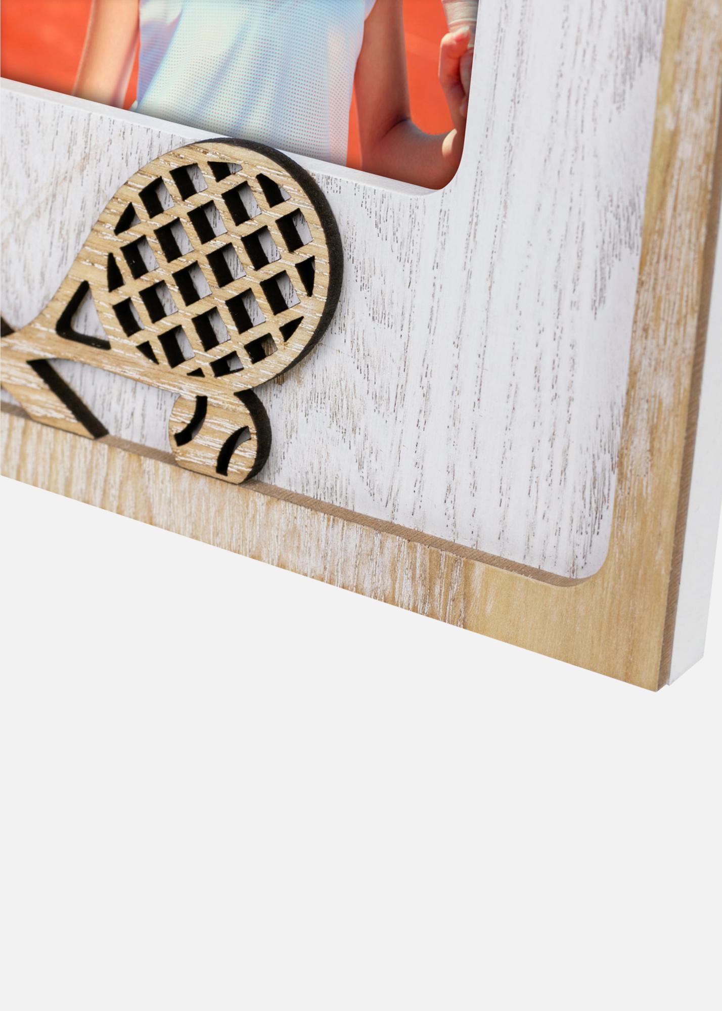 Športno navdihnjen foto okvir s teniško temo. Okrašen z izrezanimi teniškimi loparji, popoln za okvirjanje spominov s teniškega igrišča ali športnih aktivnosti. Primeren za velikost slike 10x15 cm.
