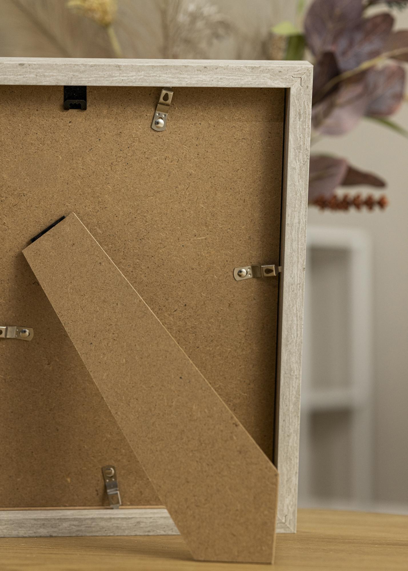 Ta okvir za slike je izdelan iz MDF, in ima mat sivo premazano površino z lepo teksturo lesa. Steklo v okvirju je pravo steklo. Slike in passepartout se pritrdijo preko hrbtne strani okvirja. Samo obrnite kovinske sponke, ki držijo hrbtni del, in nato vstavite svoje motive.