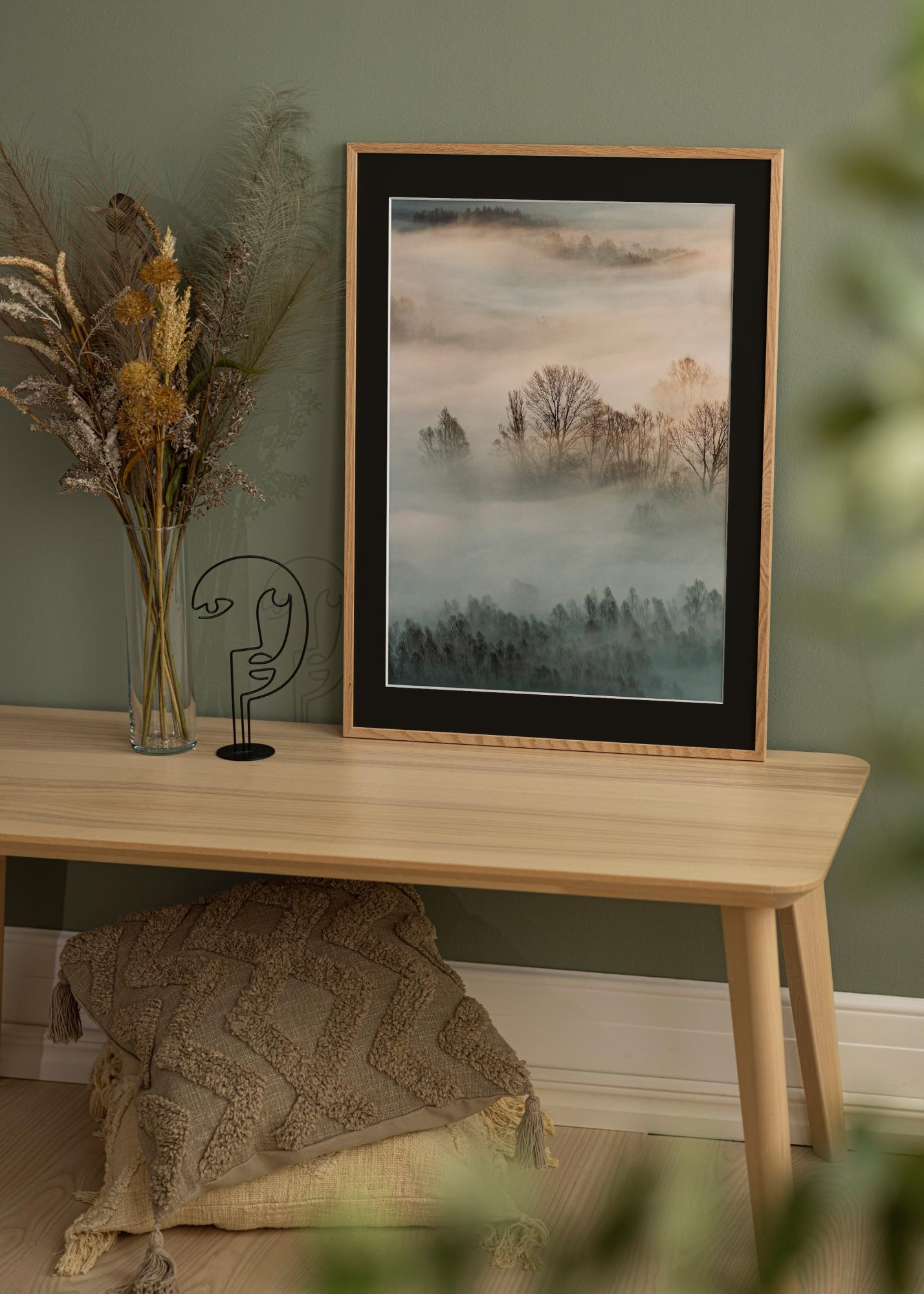 Okvir, s svojo vitko širino 12 mm in globino 18 mm, ima mat zaključek, ki dopolnjuje črno paspartujo in ustvarja harmonično celoto. Opremljen je s kovinskimi obešalniki na hrbtni strani, kar olajša obešanje slike tako horizontalno kot vertikalno, glede na orientacijo motiva.