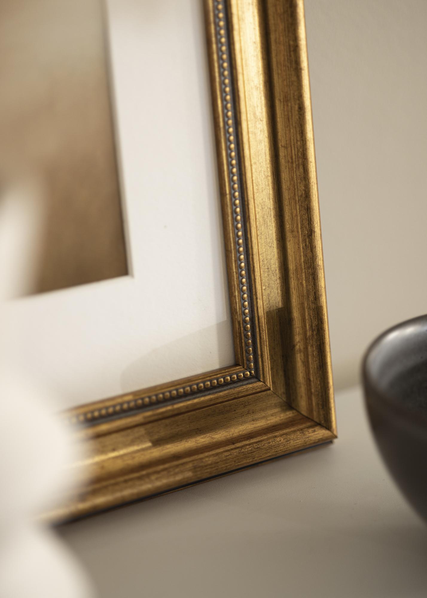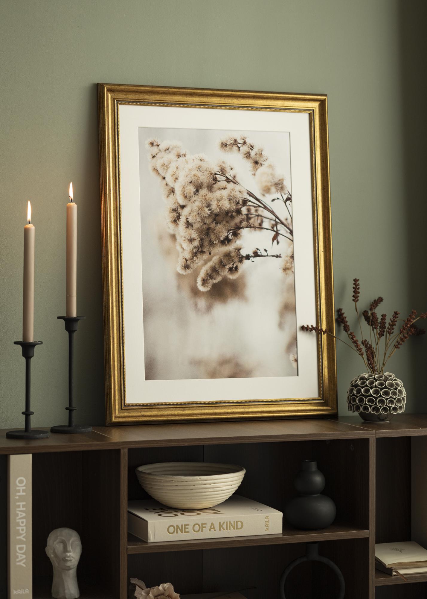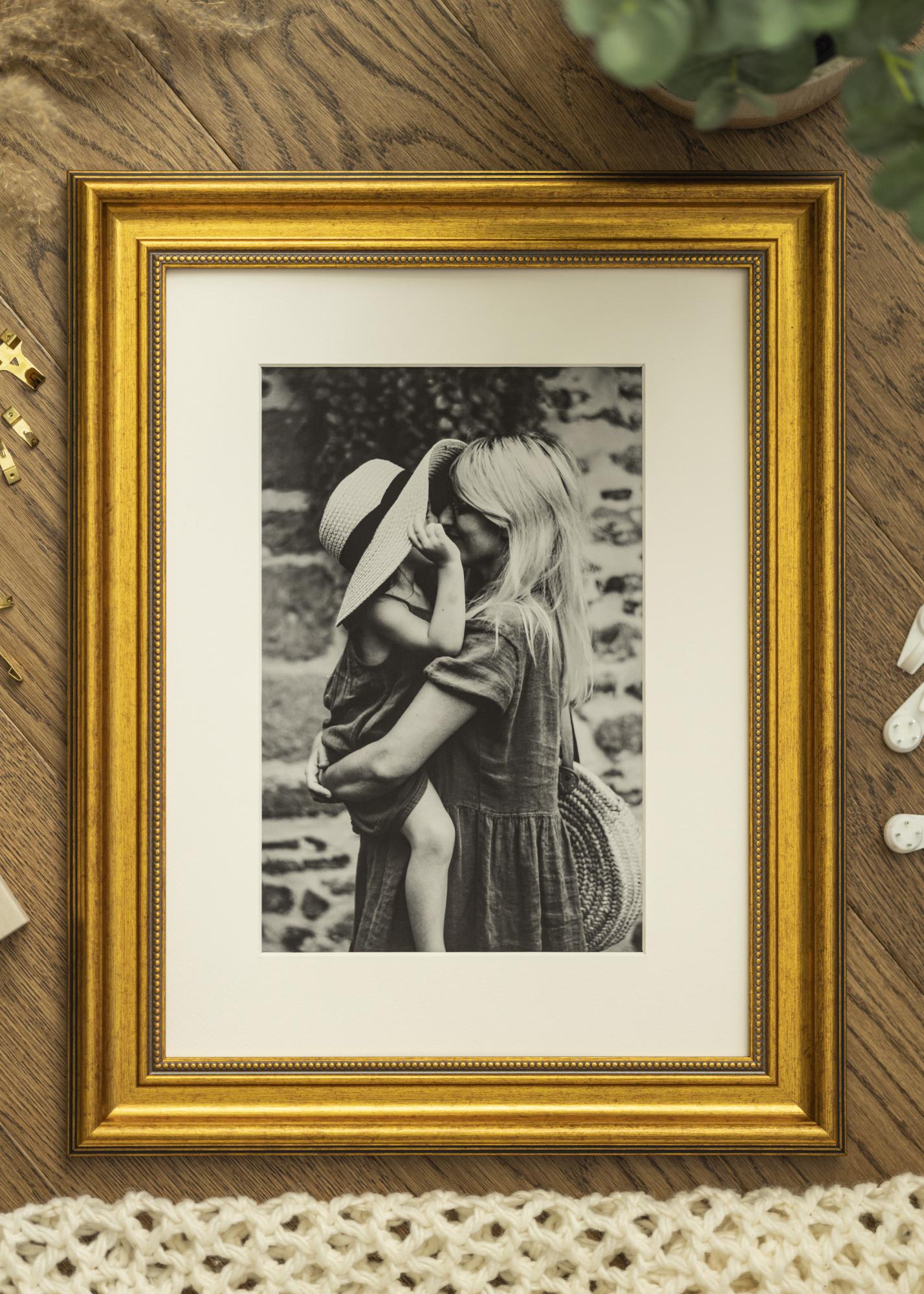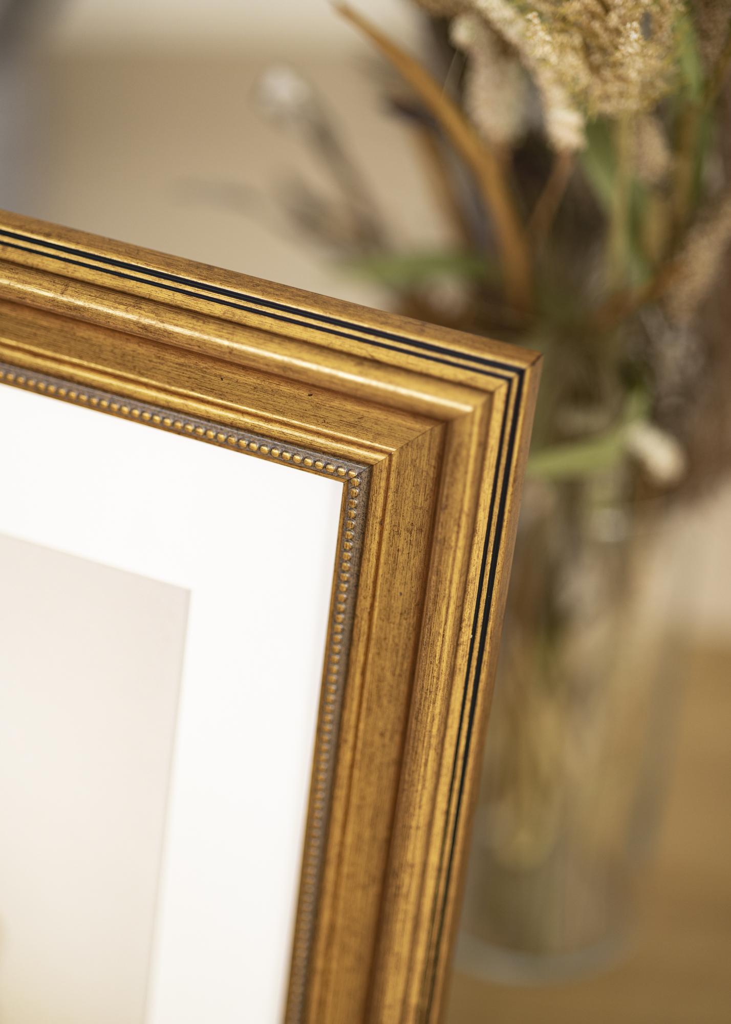 Rokoko je zlati okvir, ki daje čudovit vintage občutek vsem vašim najljubšim motivom. Okvir ima 50 mm širok okvirni trak v odtenku sijajnega antikvinskega zlata ter lepo obrabljeno površino, ki poudarja klasičen videz okvirja. Okvir je primeren za osebne fotografije, pa tudi za abstraktne plakate – in ne glede na to, kateri motiv izberete, ga lahko brez težav namestite. Preprosto sprostite zadnjo stranico okvirja, ki jo držijo majhni upogljivi žebljički, in nato postavite svojo stensko umetnino poleg okvirnega stekla.