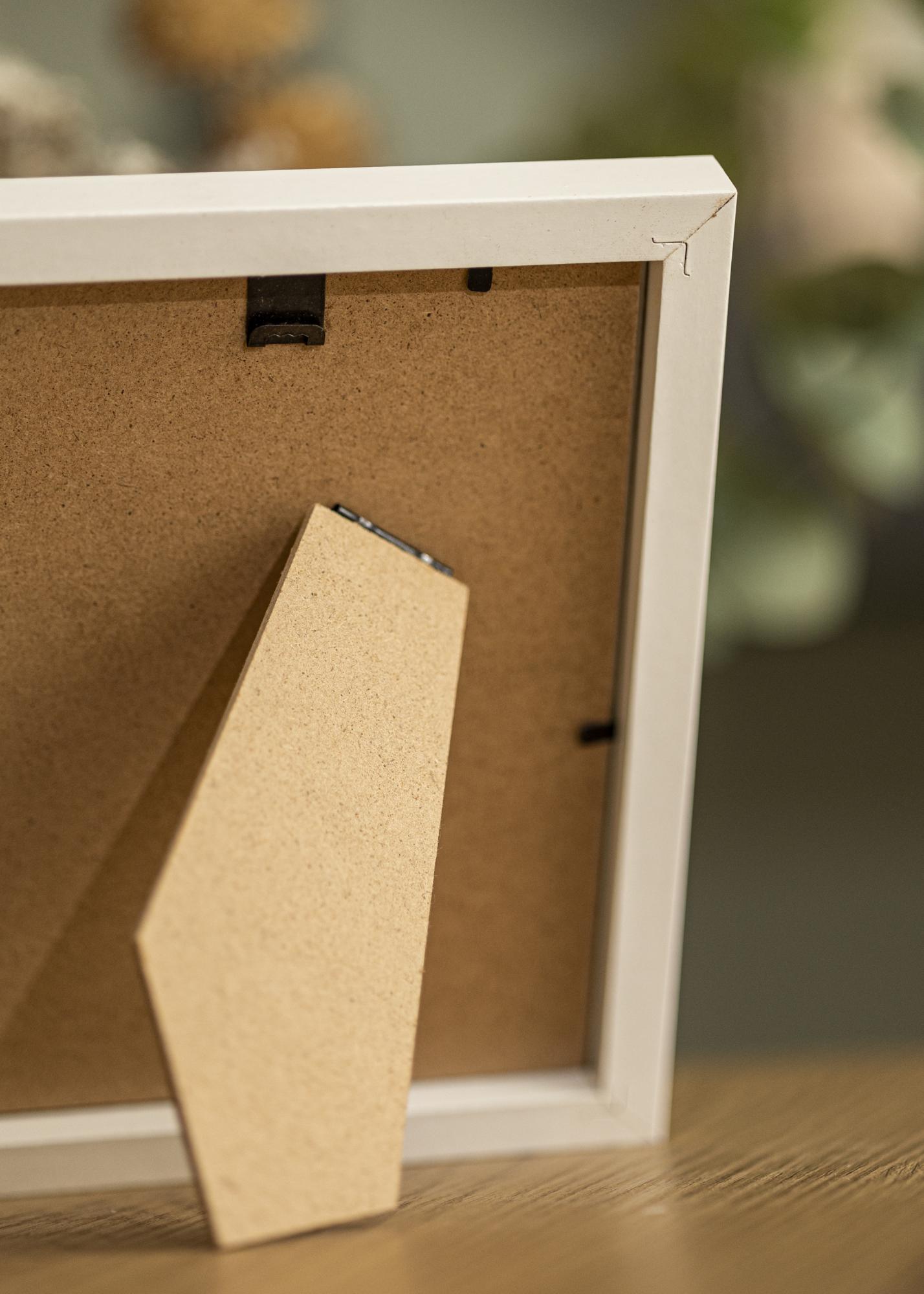 Letvica okvirja ima tako širino kot globino 18 mm. Bela barva se dobro ujema z večino motivov in jo je preprosto uskladiti s preostalo opremo v vašem domu. Hrbtni del okvirja je na mestu držan z majhnimi žebljički, ki jih zlahka upognete, da odstranite zadnjo ploščo in namestite vaše motive. Na zadnji strani okvirja so praktični zidni nosilci, ki omogočajo obešanje okvirja tako vertikalno kot horizontalno.