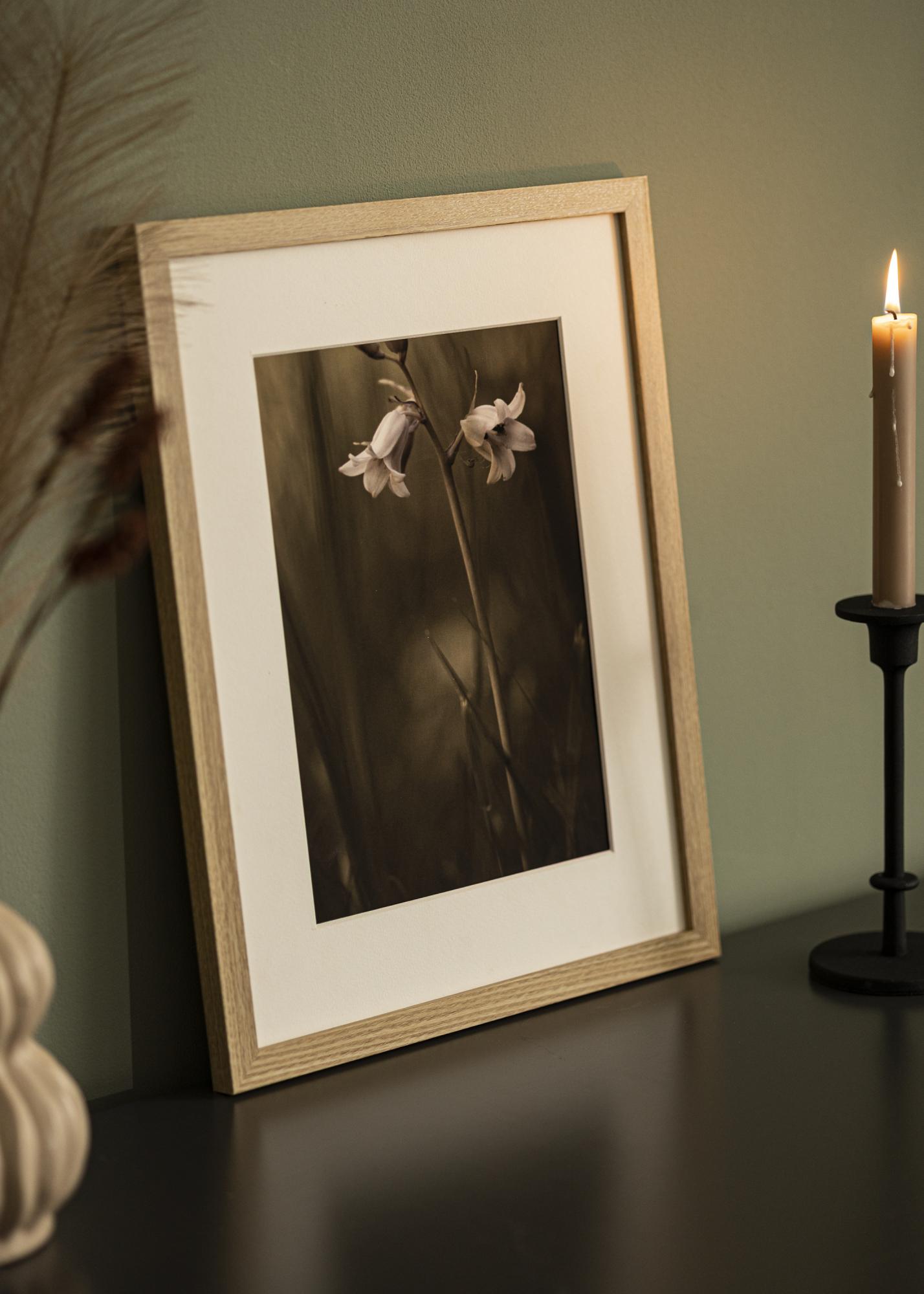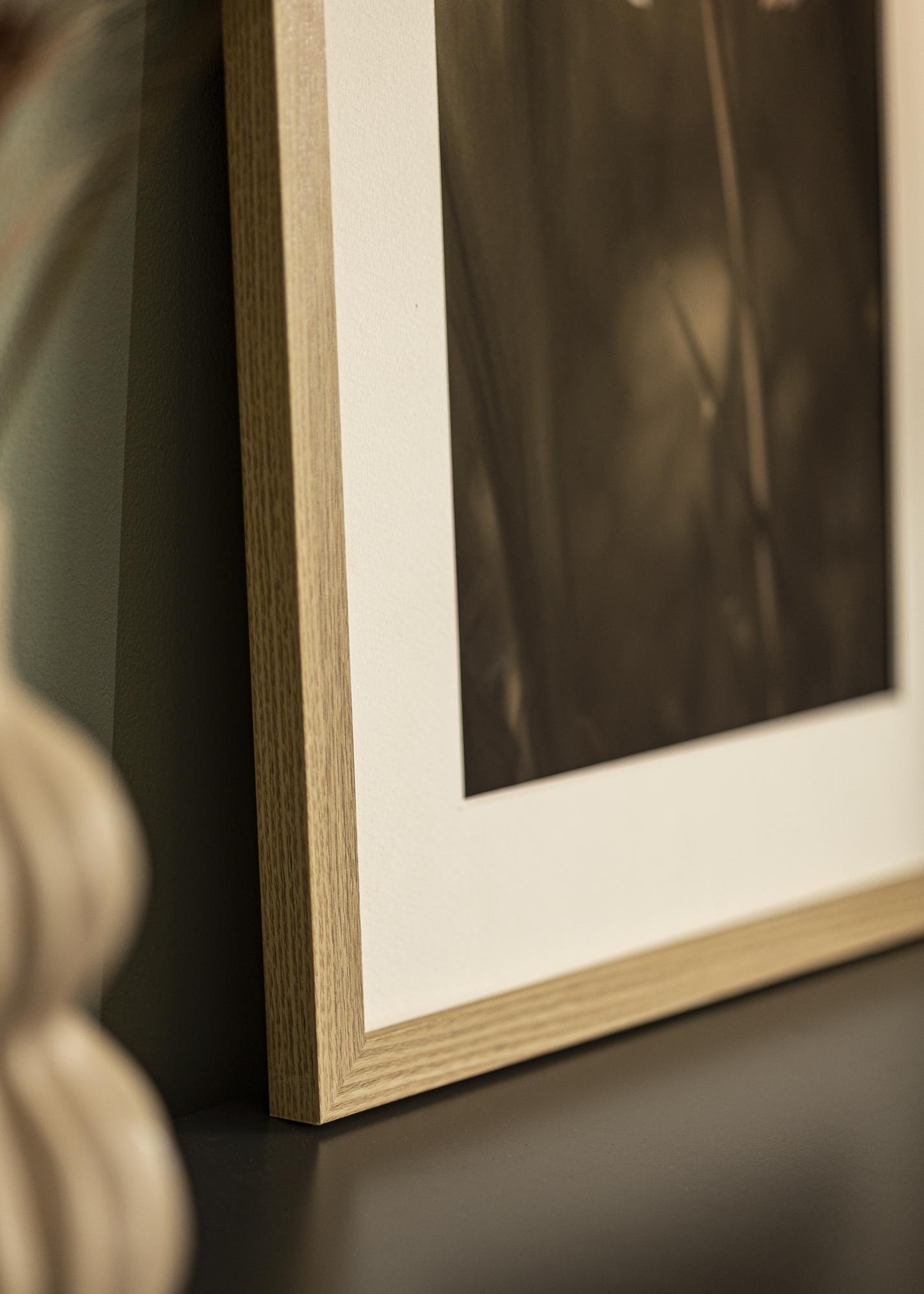 To je okvir s paspartujem, ki je širok 18 mm in globok, s klasičnim kvadratnim profilom in lepo površino z leseno teksturo. Naraven videz omogoča, da okvir odlično ustreza naravnim motivom ali sodobnim slikam, ki so v kontrastu s slikarskim okvirjem. Motiv je pritrjen v okvir s pomočjo gibljivih zatičev na zadnji strani okvirja.