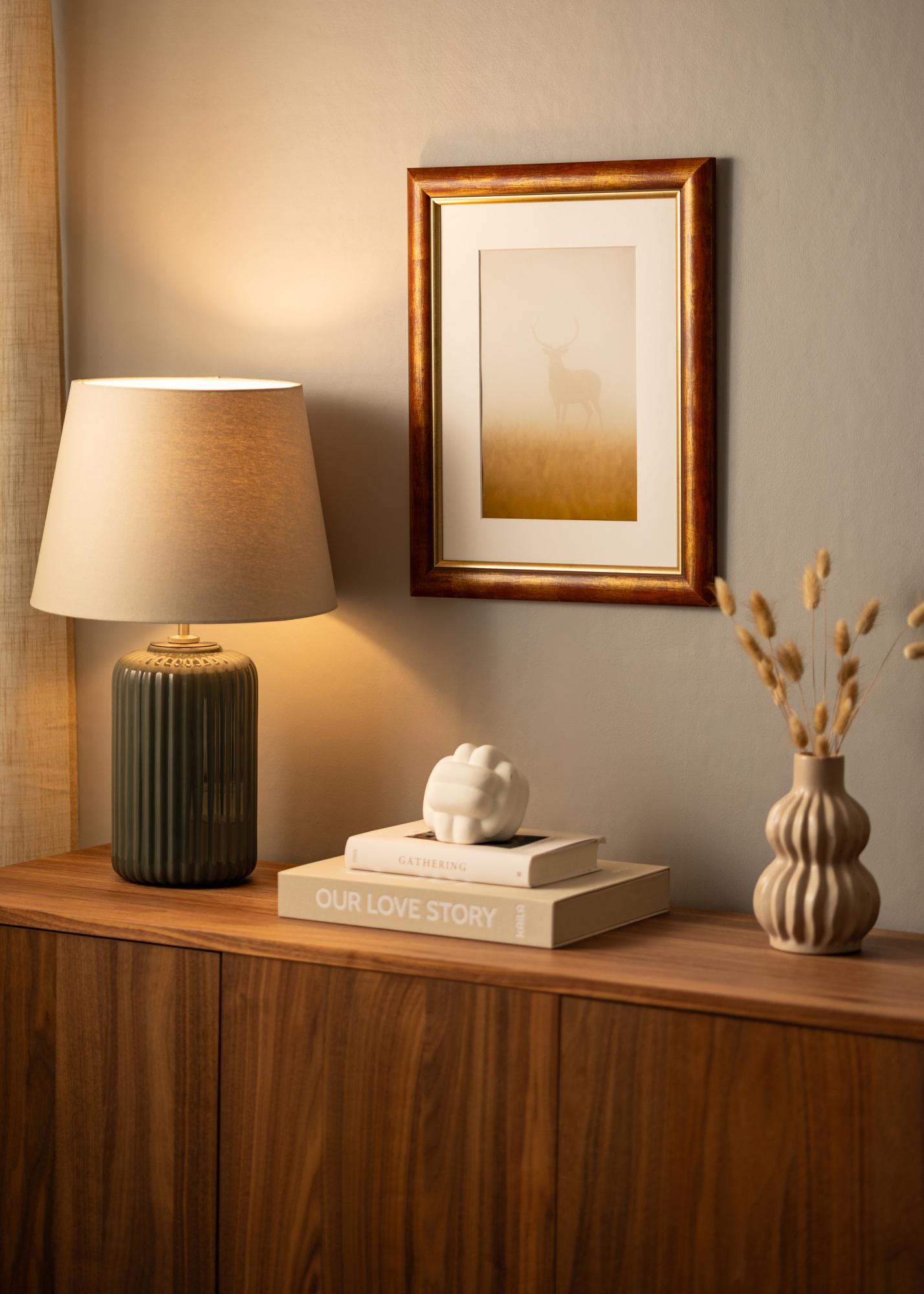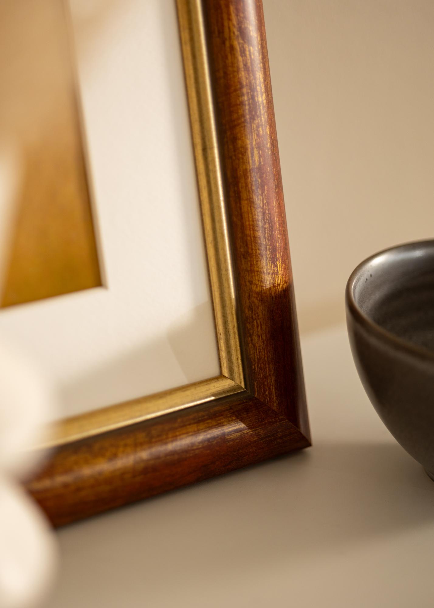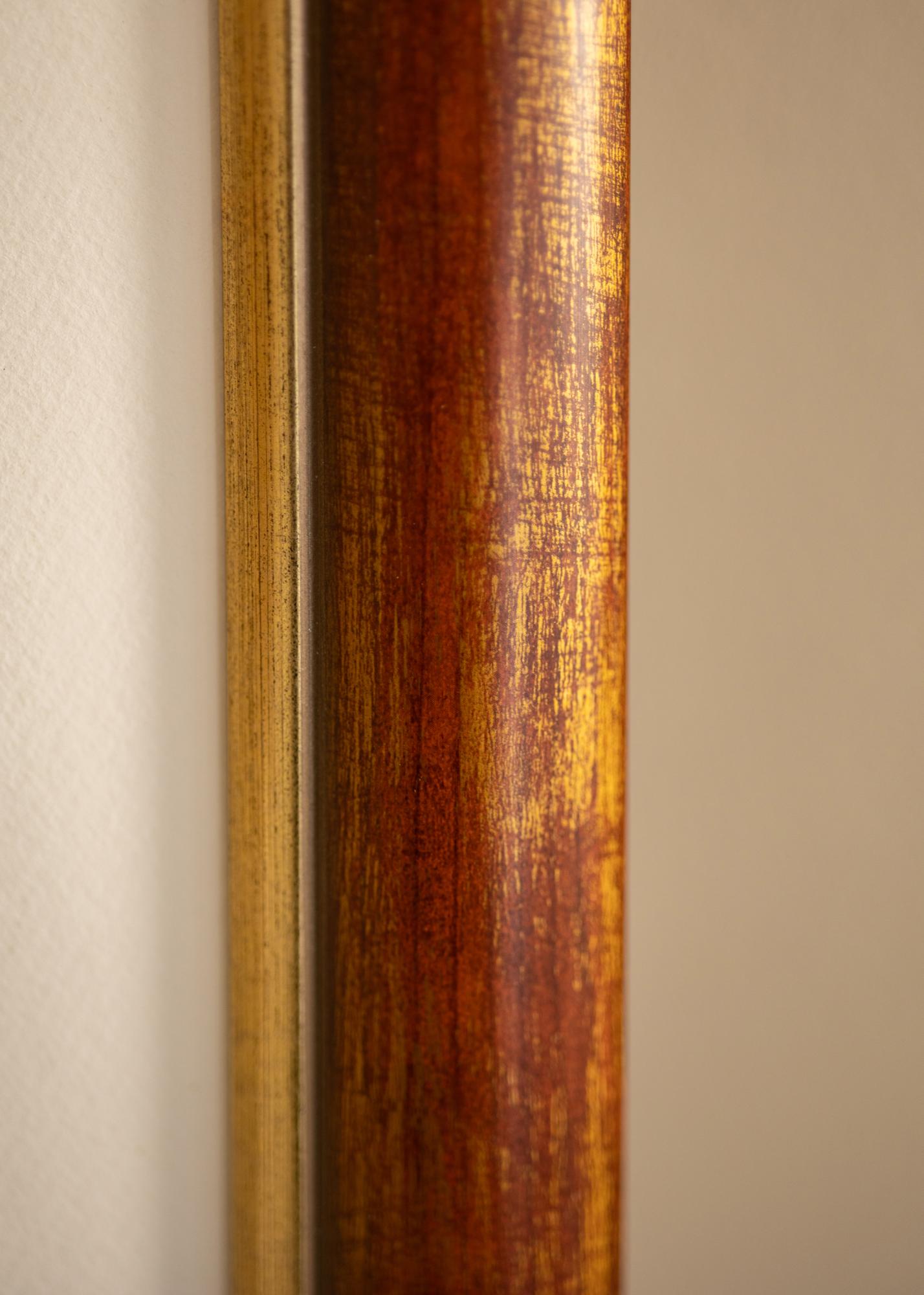 Časovno neomejen lesen okvir izdelan na Finskem z elegantno rdečkasto leseno površino in zlatim robom ob motivu. Daje harmoničen občutek motivu. Okvir ima širok profil celih 41 mm in globino 19 mm, kar daje dodatno globino okvirjanju.