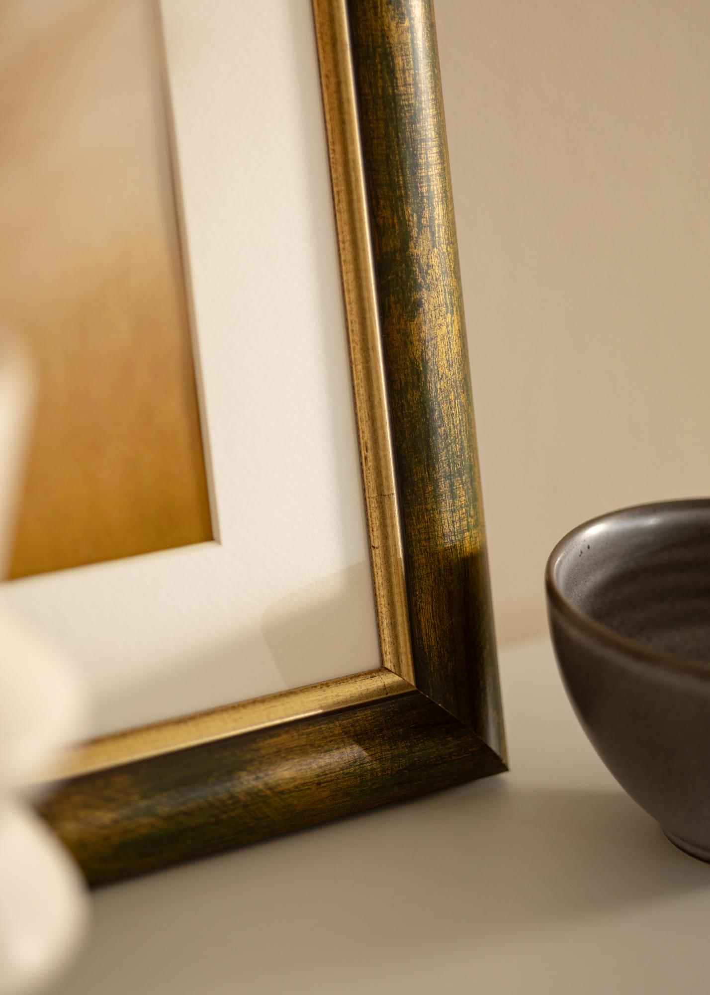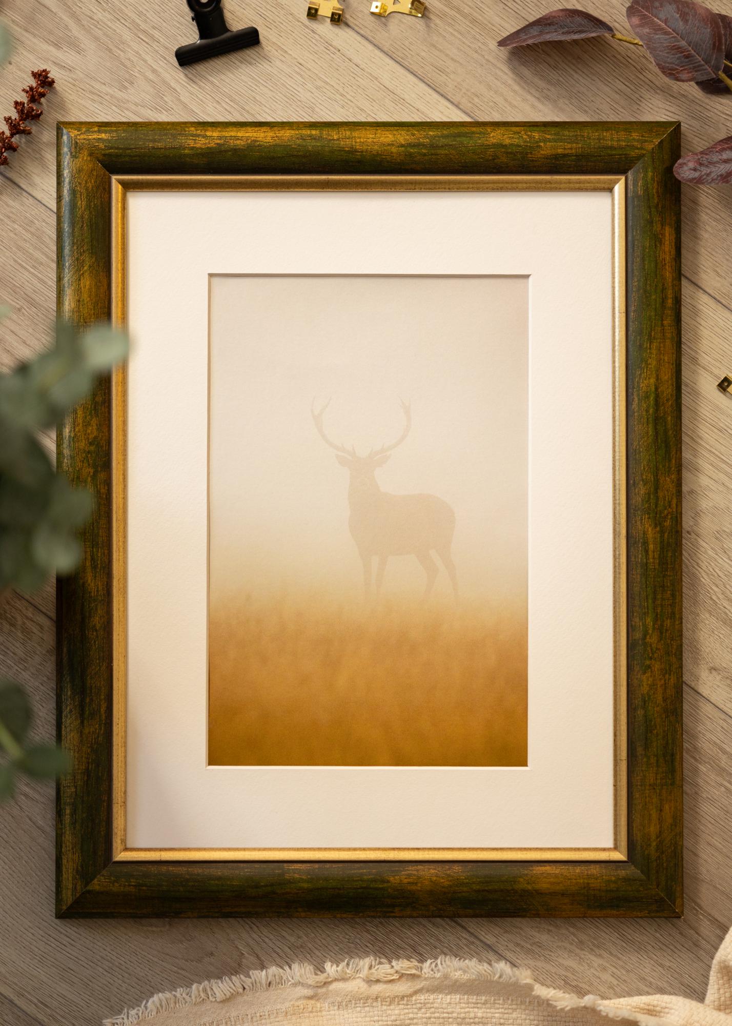 Časovno neomejen okvir iz lesa, izdelan na Finskem, z elegantno leseno površino v zelenkastem odtenku in z zlato obrobo ob motivu. Okvir motivu dodaja harmoničen občutek. Profil okvirja je širok 41 mm in ima globino 19 mm, kar dodaja dodatno globino okvirjanju.