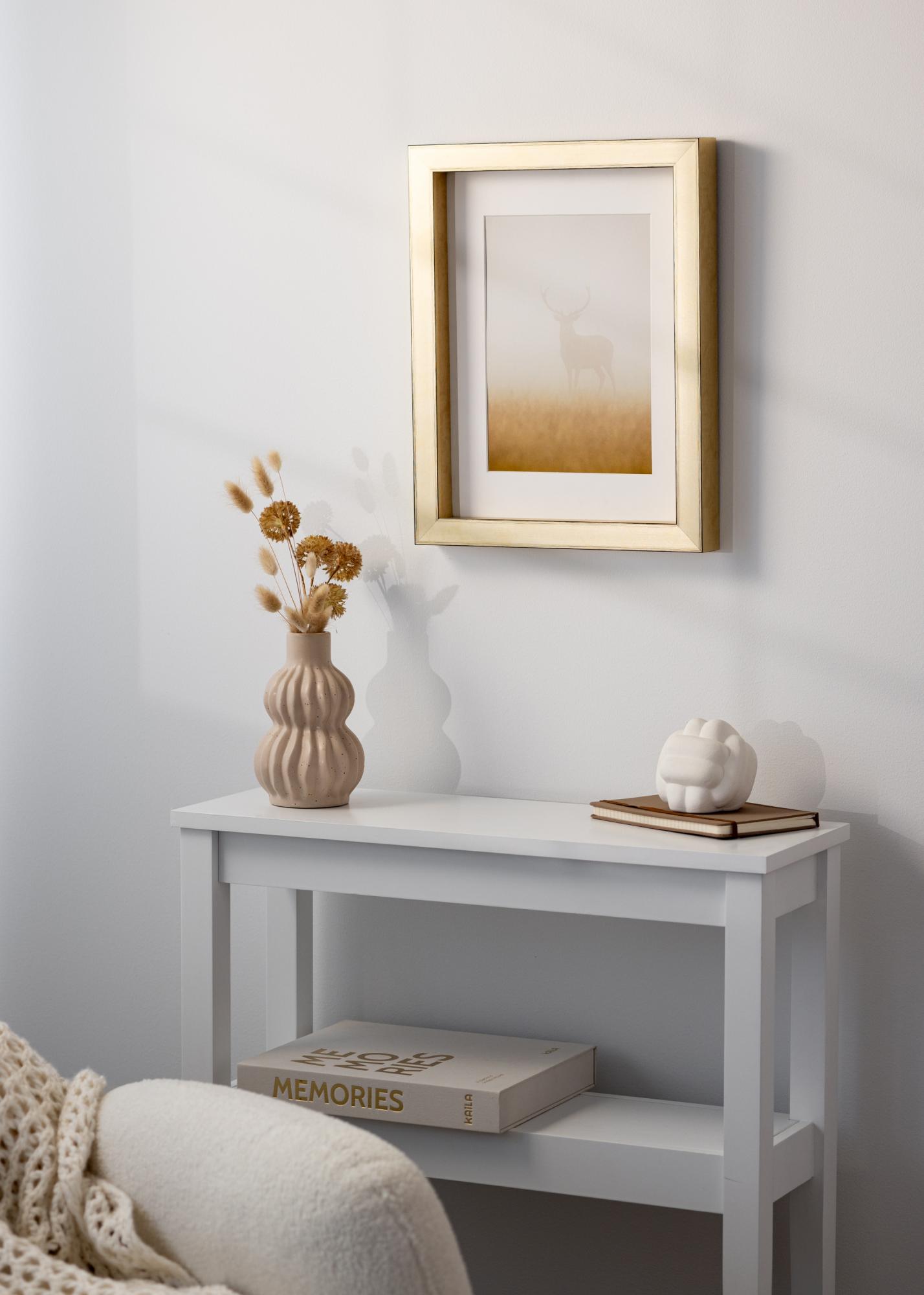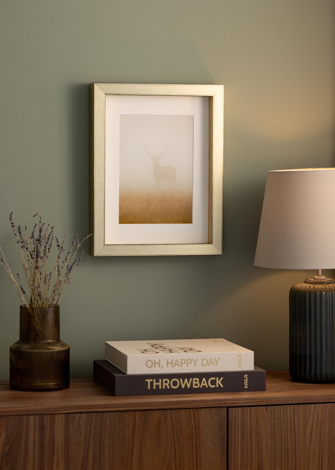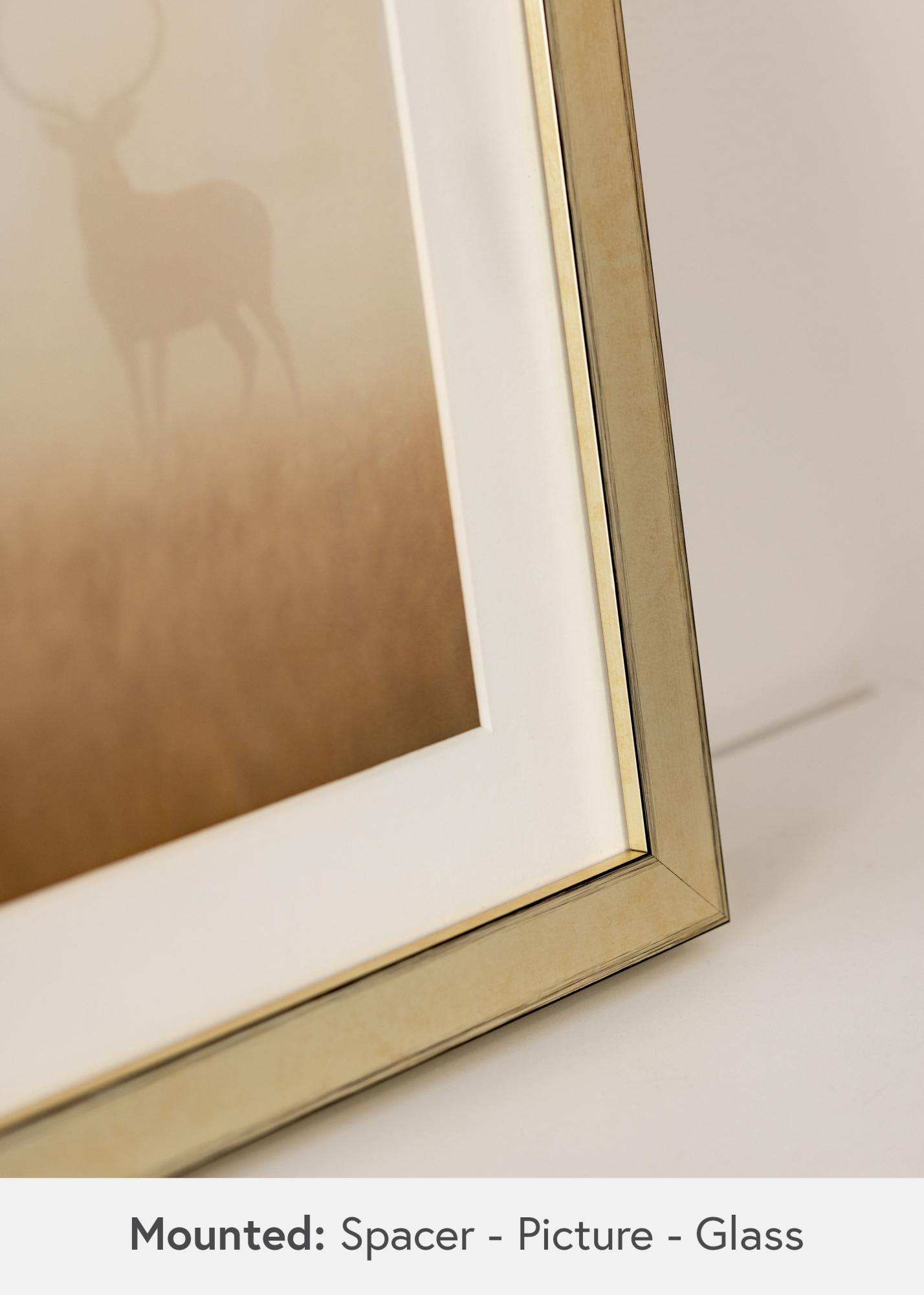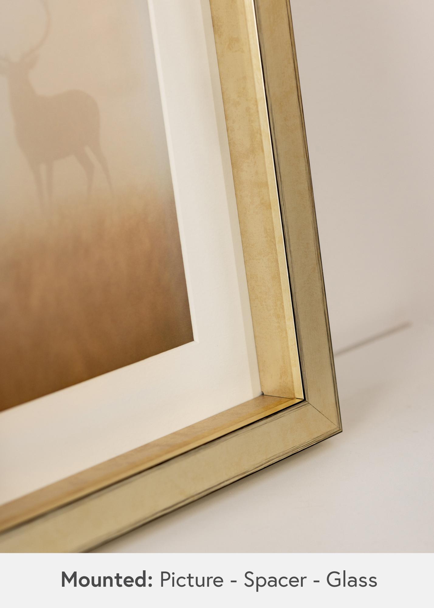 Z okvirom Tyr Zlato imate možnost prilagoditi, kako želite predstaviti svoj motiv. Lahko se odločite, da ga postavite na zadnji del okvirja za lebdeči vtis, ali pa bližje sprednji strani za bolj tradicionalno uokvirjanje. Ta prilagodljivost olajša ujemanje okvirja z vašim umetniškim delom in vašim notranjim stilom.
