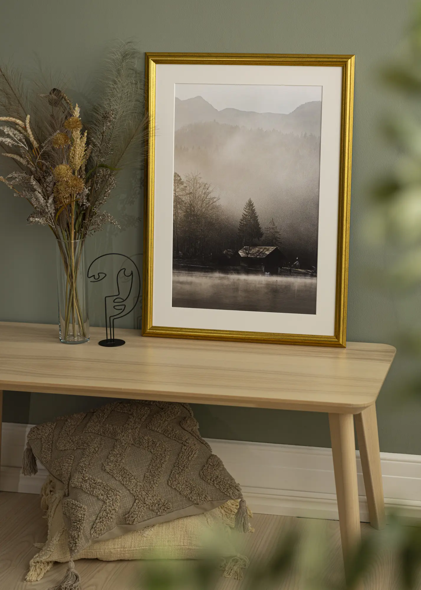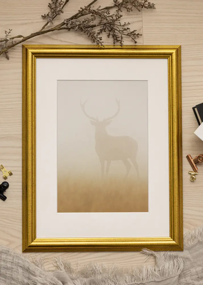 Povečajte svojo najljubšo sliko z dotikom elegance s to stilno zlato okvirja za fotografije. Z širino 31 mm in globino 17 mm okvir zagotavlja robustno in luksuzno obrobo za vašo sliko. Bela paspartu poudari motiv in ustvari vizualni počitek med sliko in okvirjem, kar okrepi izraz umetniškega dela in prispeva k profesionalni predstavitvi.