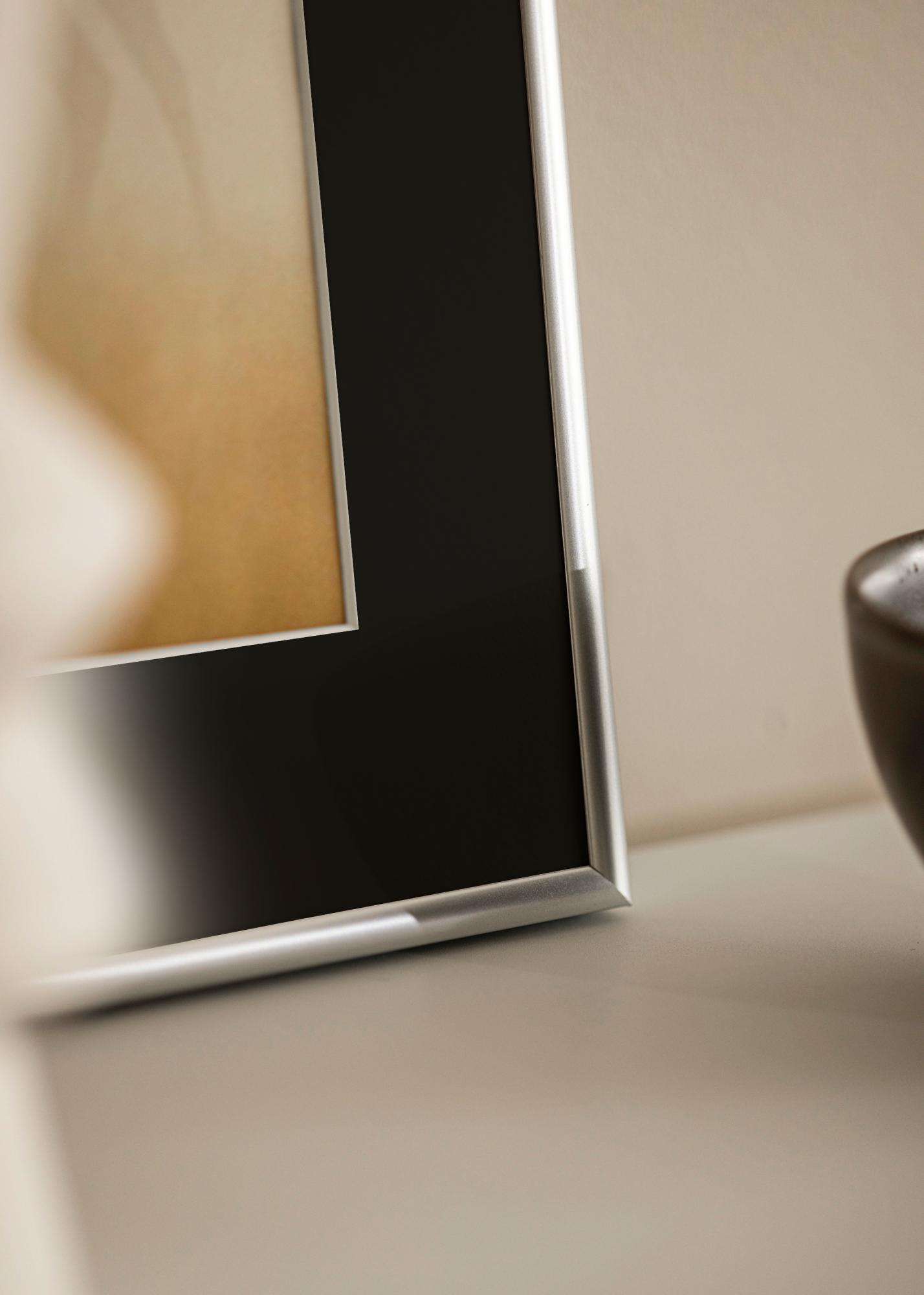 Okvir ima tanko profilirano širino 12 mm in globino 19 mm, kar zagotavlja lepo ravnovesje med robustnostjo in prefinjenostjo. Poleg tega je opremljen s črno passepartout kartonko, ki elegantno obdaja vašo sliko v velikosti 20x28 cm, kar ustvarja globino in profesionalno predstavitev.