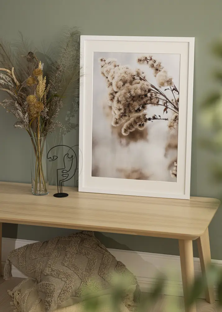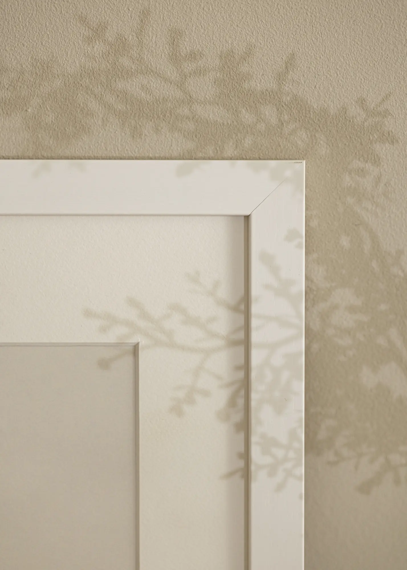 Okvir je v elegantni beli barvi, ki dopolnjuje vse tipe notranjih stilov, od modernih do klasičnih. S širino 22 mm in globino 15 mm okvir ponuja robustno konstrukcijo, ne da bi pri tem ogrozil svojo elegantno podobo. Mat zaključek prispeva k subtilnemu in prefinjenemu občutku, ki omogoča, da vaše umetniško delo zasije v ospredju.