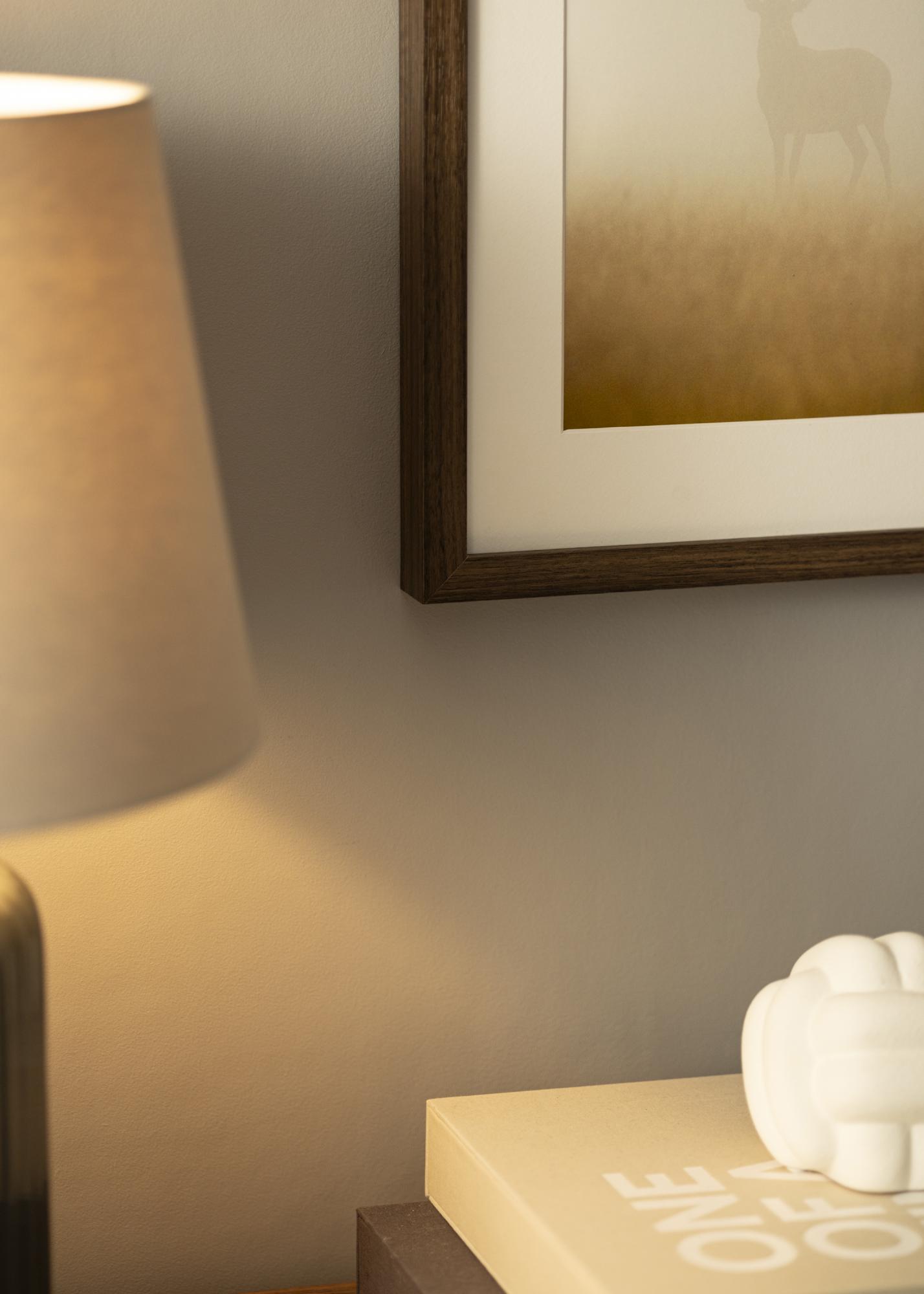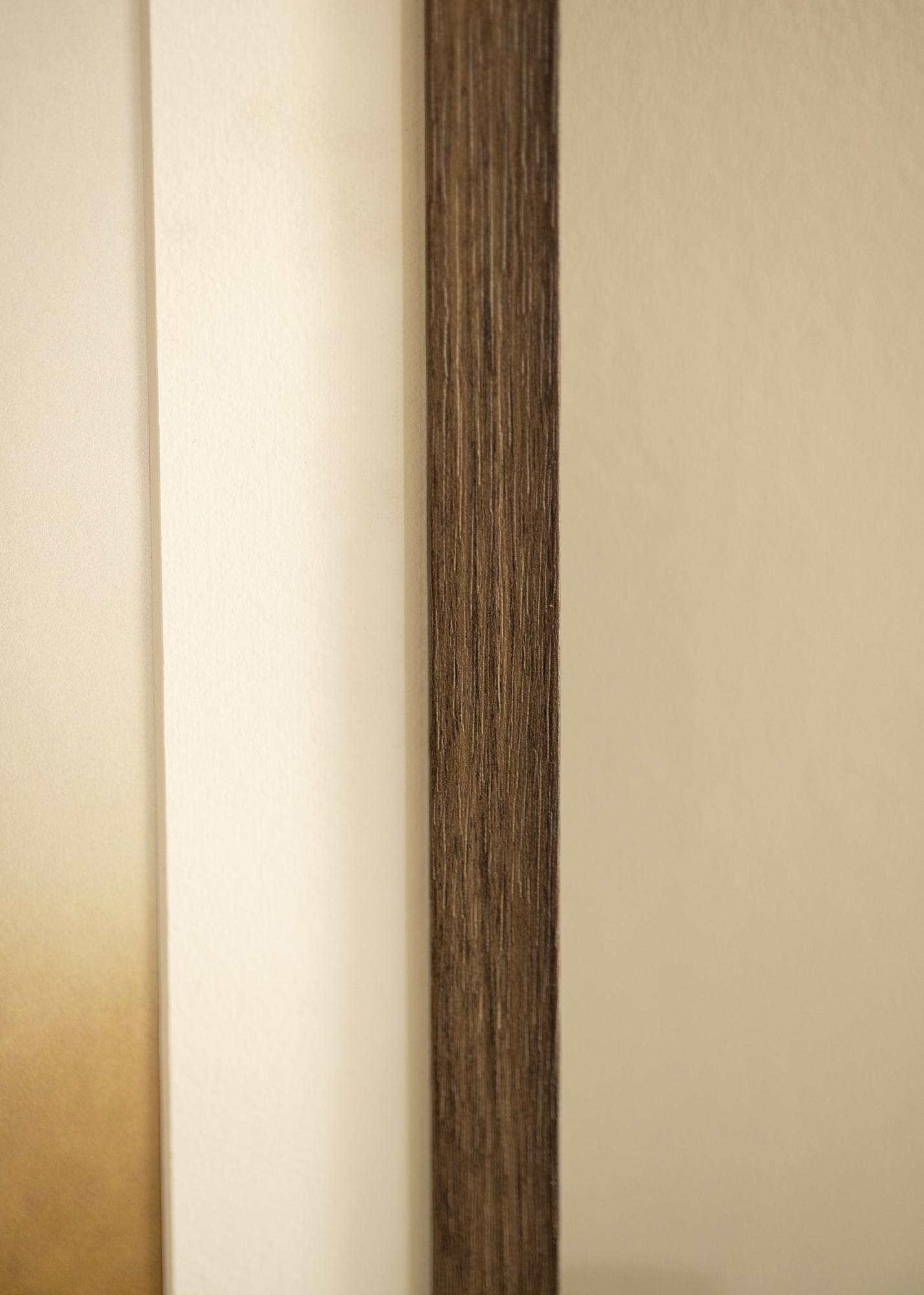 Okvir ima 21 mm širok profil in globino 38 mm, kar zagotavlja stabilen in robusten občutek, ne da bi prevladoval nad motivom. Ravni robovi in ozek profil prispevajo k modernemu in elegantnemu dizajnu, ki se preprosto zlije v različne notranje stile. Subtilne barvne spremembe v vzorcu lesa poleg tega dodajajo globino in variacijo, zaradi česar je vsak okvir za slike unikaten.
