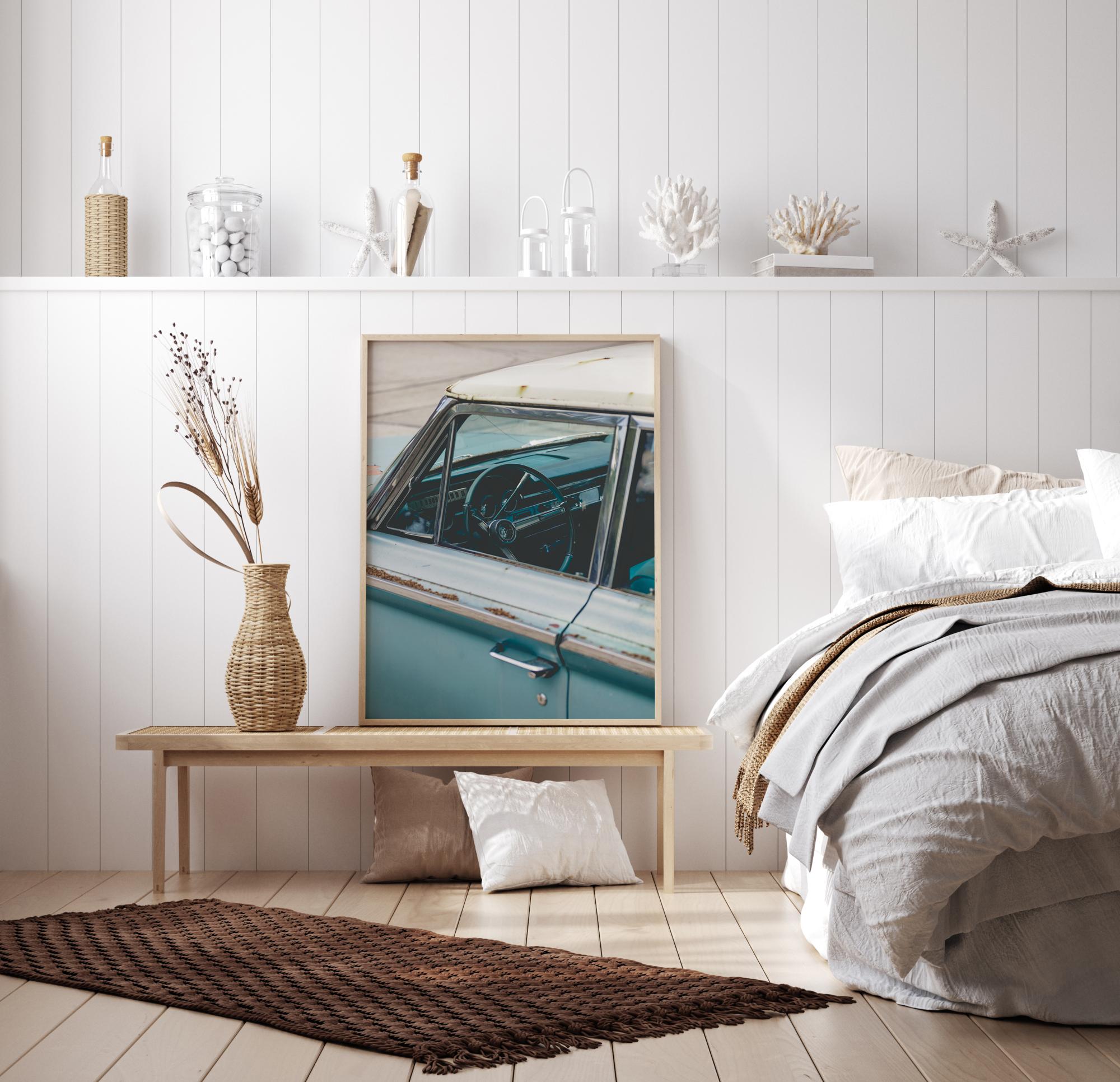 Čudovita poster z bližnjim posnetkom, ki prikazuje zarjaveli stari avto z vintage volanom in merilnikom hitrosti. Svetlo modri model avtomobila nas popelje nazaj v 1950-ta leta z najbolj kul modeli avtomobilov. Popoln tisk za obešanje v okolju z vintage stilom.