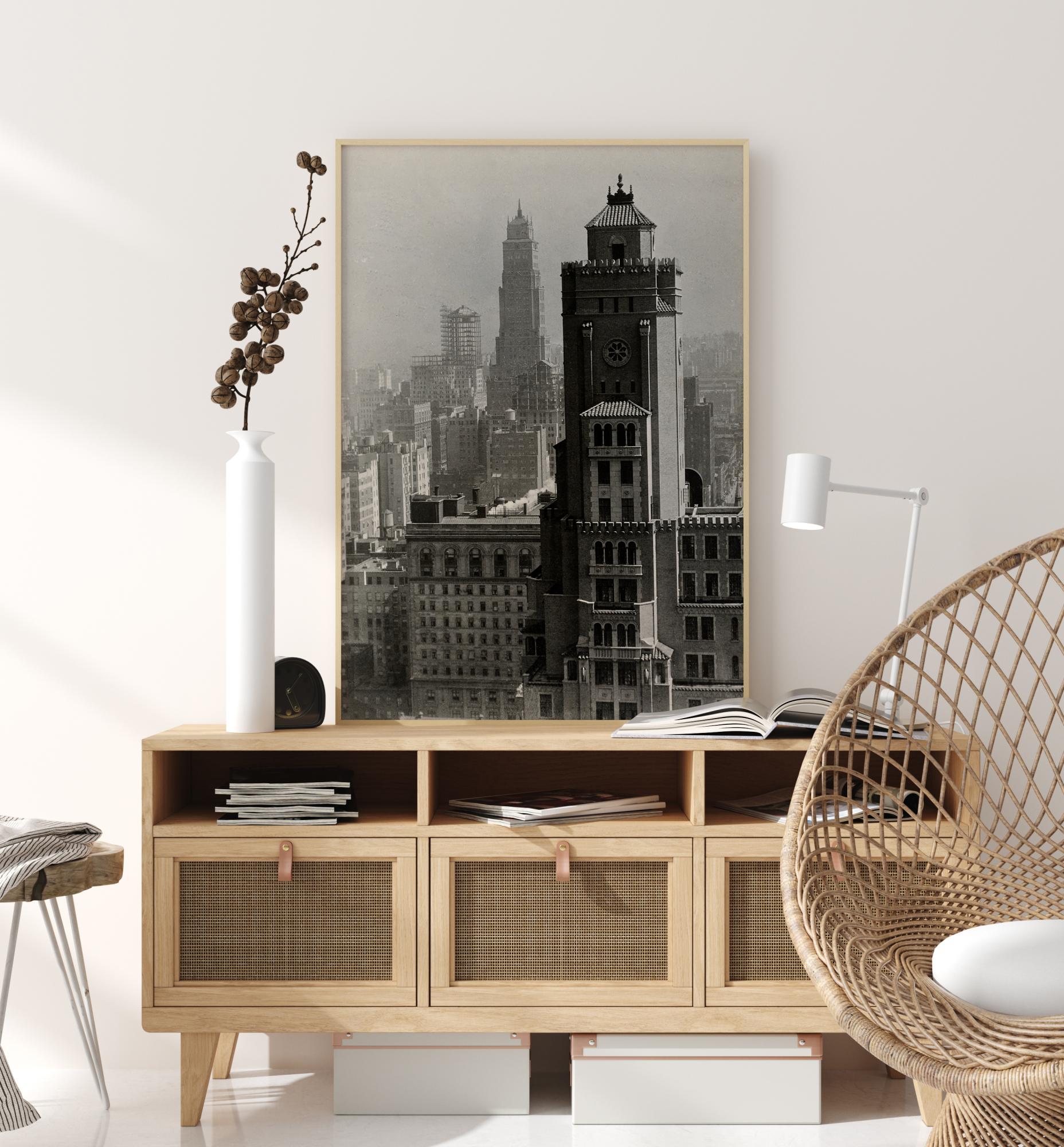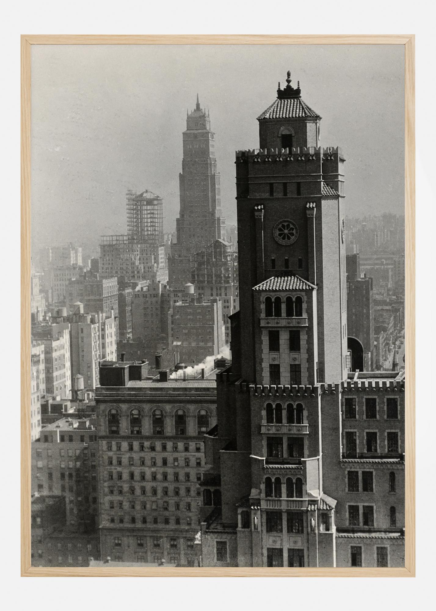 Črno-beli tisk z starim mestom. Siva mestna silhueta se popolnoma zlije z enako sivimi stavbami. Mesto sestavljajo stavbe različnih višin. V ospredju naravna svetloba neposredno sveti na vzhodno stran glavne stavbe. Obesite ta plakat v svojo delovno sobo in opazujte staro mesto.