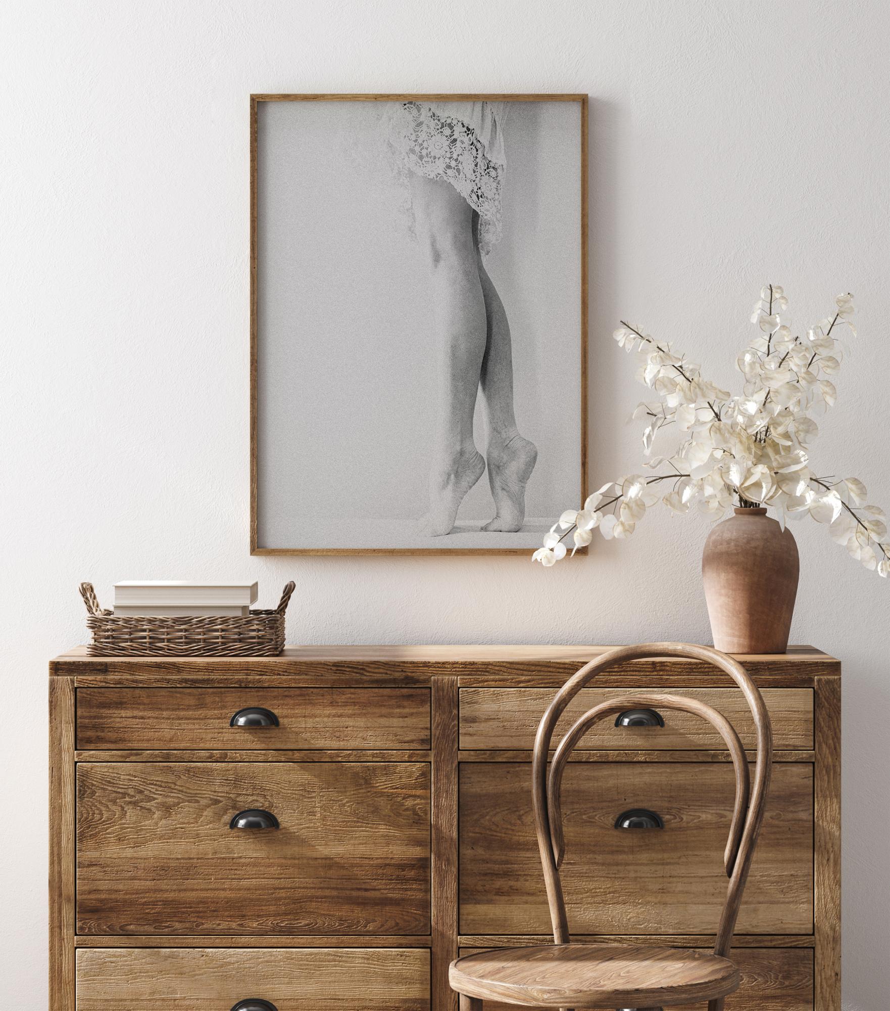 Eleganten polovični portret ženske, ki stoji na prstih. Preprostost slike v kombinaciji z nežnimi belimi odtenki naredi to sliko odličen dodatek za vašo spalnico ali dnevno sobo.