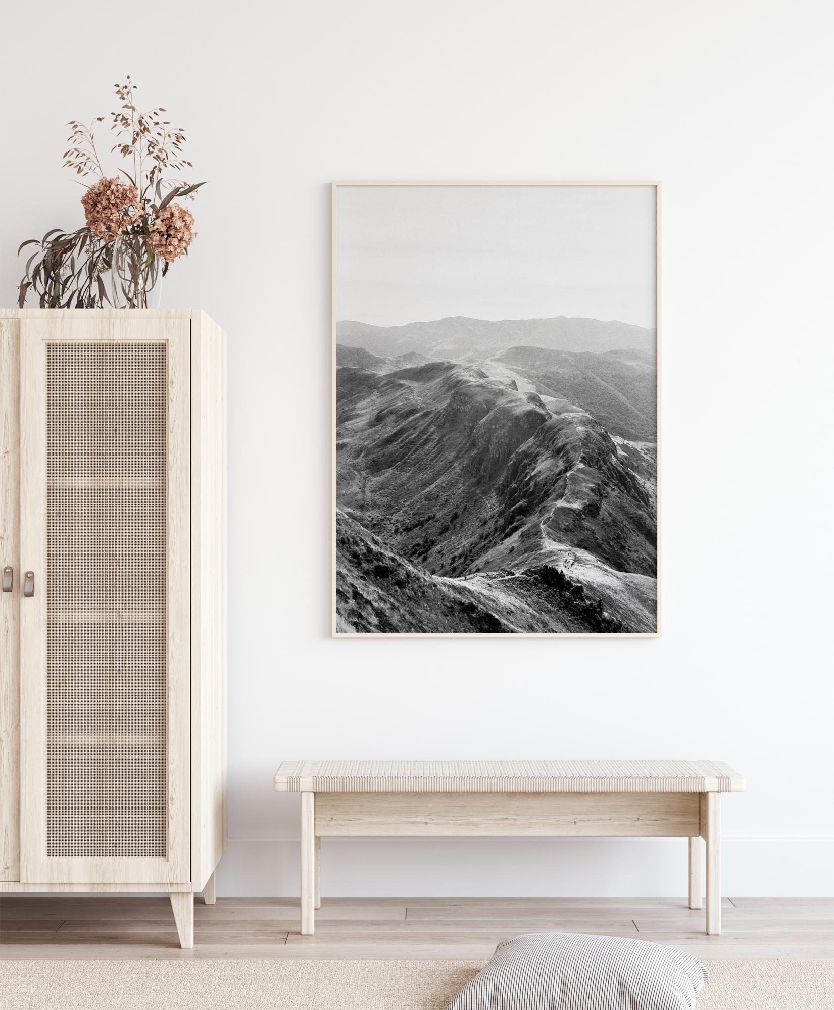 Črno-beli poster z gorsko verigo. Različni sivkasti odtenki se popolnoma zlijejo drug z drugim. Brez znakov vegetacije ali življenja je skoraj mogoče slišati tišino na gorskih vrhovih. Obesite ta tisk na barvito steno in poslušajte veter, ki piha.