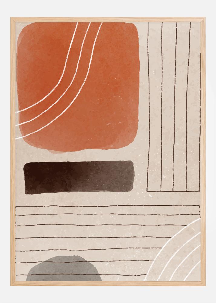 Ta umetniški plakat igra na abstrakcijo in geometrijo ter vzbuja globljo občutje refleksije. V motivu je velika, polna terakotna kvadratka, ki sidra oblikovanje, obrobljena z belimi ukrivljenimi linijami, ki dajejo vtis gibanja in mehkobe. Ta topla, zemeljska barva ustvarja takojšen občutek topline in dobrodošlice.