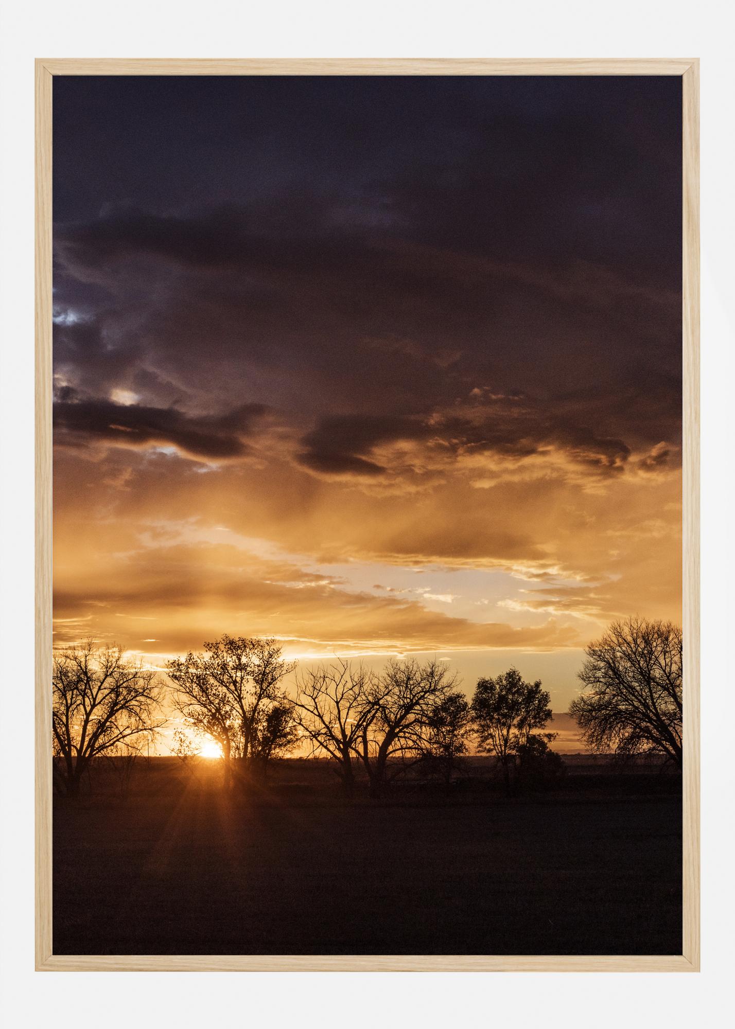 Osupljiv tisk oranžnega sončnega zahoda. Sončni zahod na obzorju poudarja jesenska drevesa na poljih. S spektakularnim nebom oranžni odtenki ustvarjajo toplo in pomirjujočo atmosfero. Čudovit plakat, ki prinaša toplino v vašo dnevno sobo.