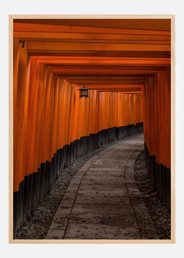Plakat s kamnito potjo, obdano z oranžnimi in črnimi lesenimi oporami. Sredi poti visi železna svetilka. Naravna svetloba sveti na pot, kjer je padlo nekaj majhnih jesenskih listov. Čudovit tisk, ki lahko poživi katero koli steno.