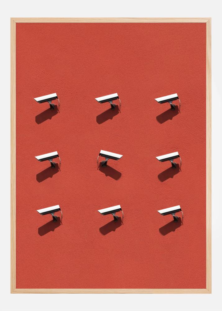 Ta premišljujoč plakat ustvarja močan vizualni vtis s svojim minimalističnim, a močnim sporočilom. S tem, ko prikazuje vrsto nadzornih kamer na enobarvni podlagi, slika poziva gledalca, da razmisli o temah, kot sta nadzor in zasebnost v sodobni družbi. Njegova preprosta kompozicija in drzna uporaba barv zagotavljata močan in hkrati eleganten izraz.