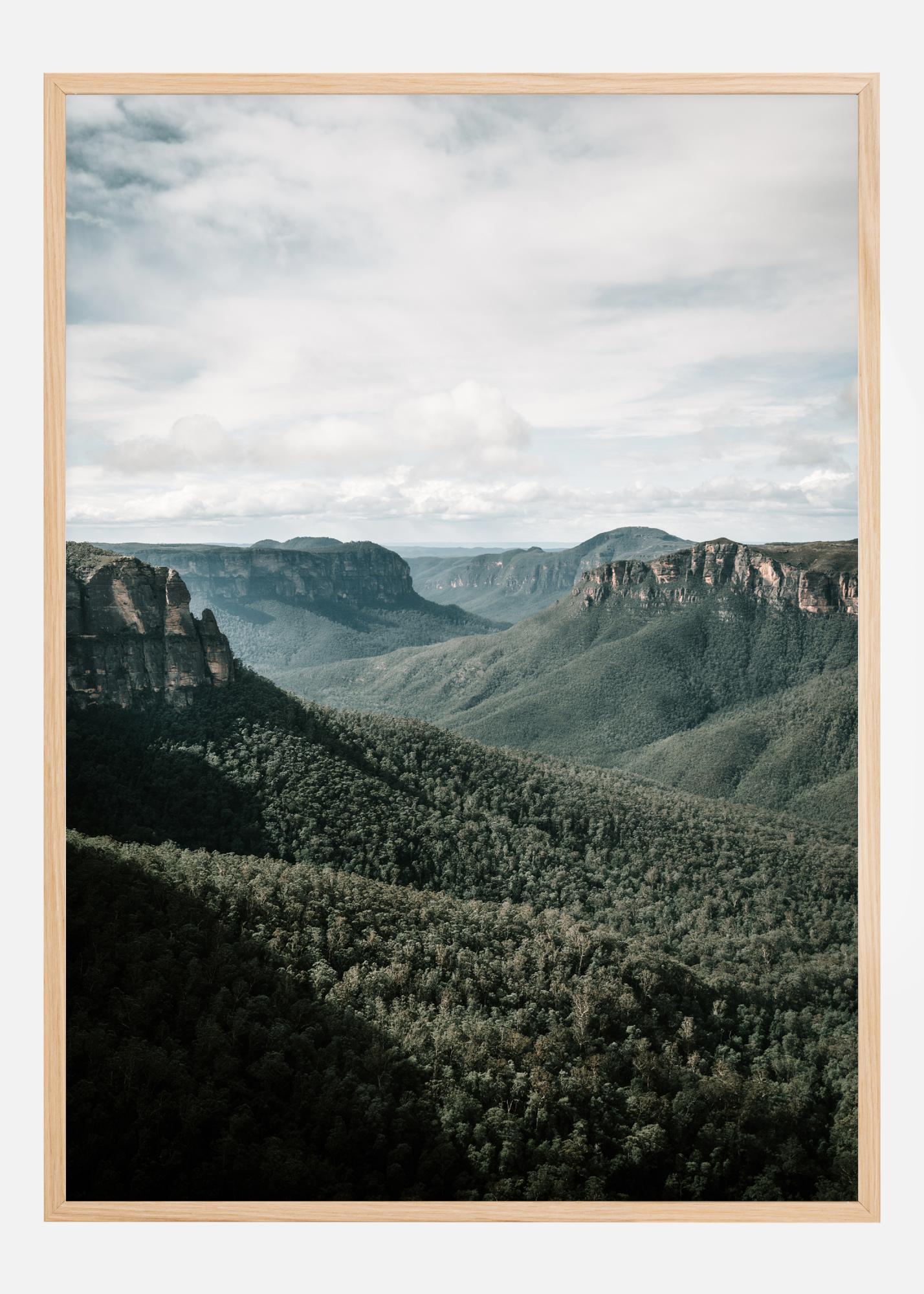 Osupljiv tisk pokrajine z griči. Gosta vegetacija pokriva pokrajino od doline do skalnih vrhov. Oblačno nebo poudarja mehke zelene barve hribov in ustvarja mirno vzdušje. Za ljubitelje narave je to popoln plakat za obesiti doma.