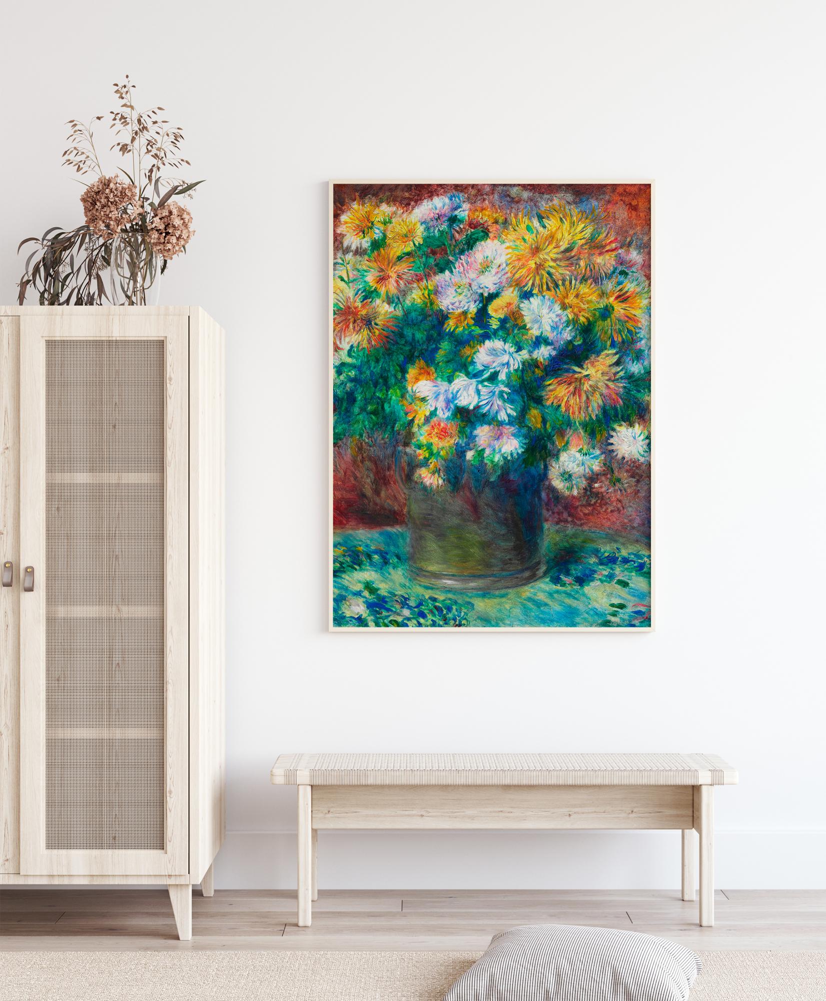 Barvita naslikana poster z šopkom cvetja. Na večbarvnem ozadju ta lepa barvna lestvica ustvarja veselo vzdušje. Rože so postavljene na turkizno platno, ki poudarja vse svetle barve na tej sliki. Popoln tisk za vse, ki imajo radi rože.