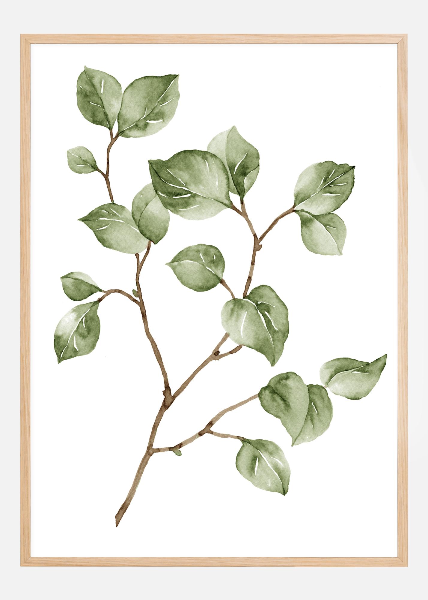 Lepa plakat z tanko rjavo vejo z majhnimi zelenimi listi. Naslikano na beli površini poudarjajo mehke rjave in zelene barve delikatne bele žilice na listih. Lep odtis za obesiti na svetlozeleno steno.