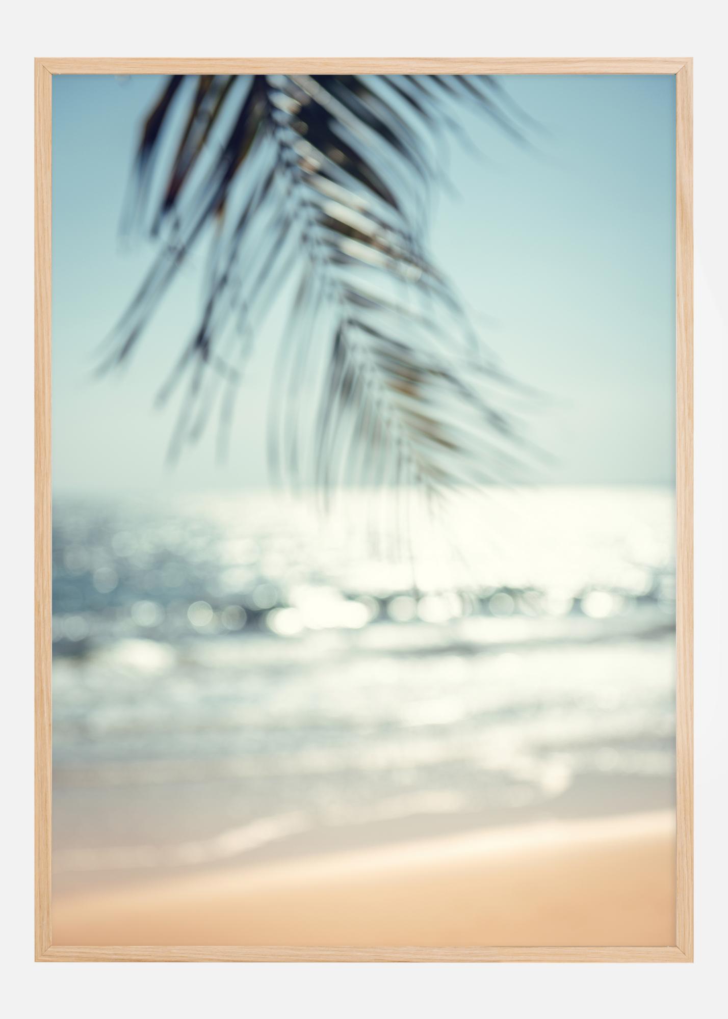 Ta plakat je sanjski pobeg v tropske širine in pomirjujoče pokrajine. Motiv se osredotoča na zamegljeno palmovo vejo, ki se razprostira čez sliko, s sijočim morjem in zlato plažo v ozadju. Barvna paleta diha toplino in sprostitev s svojimi mehkimi odtenki modre, turkizne in peščene, ki skupaj ustvarjajo občutek sončnih dni ob morju.