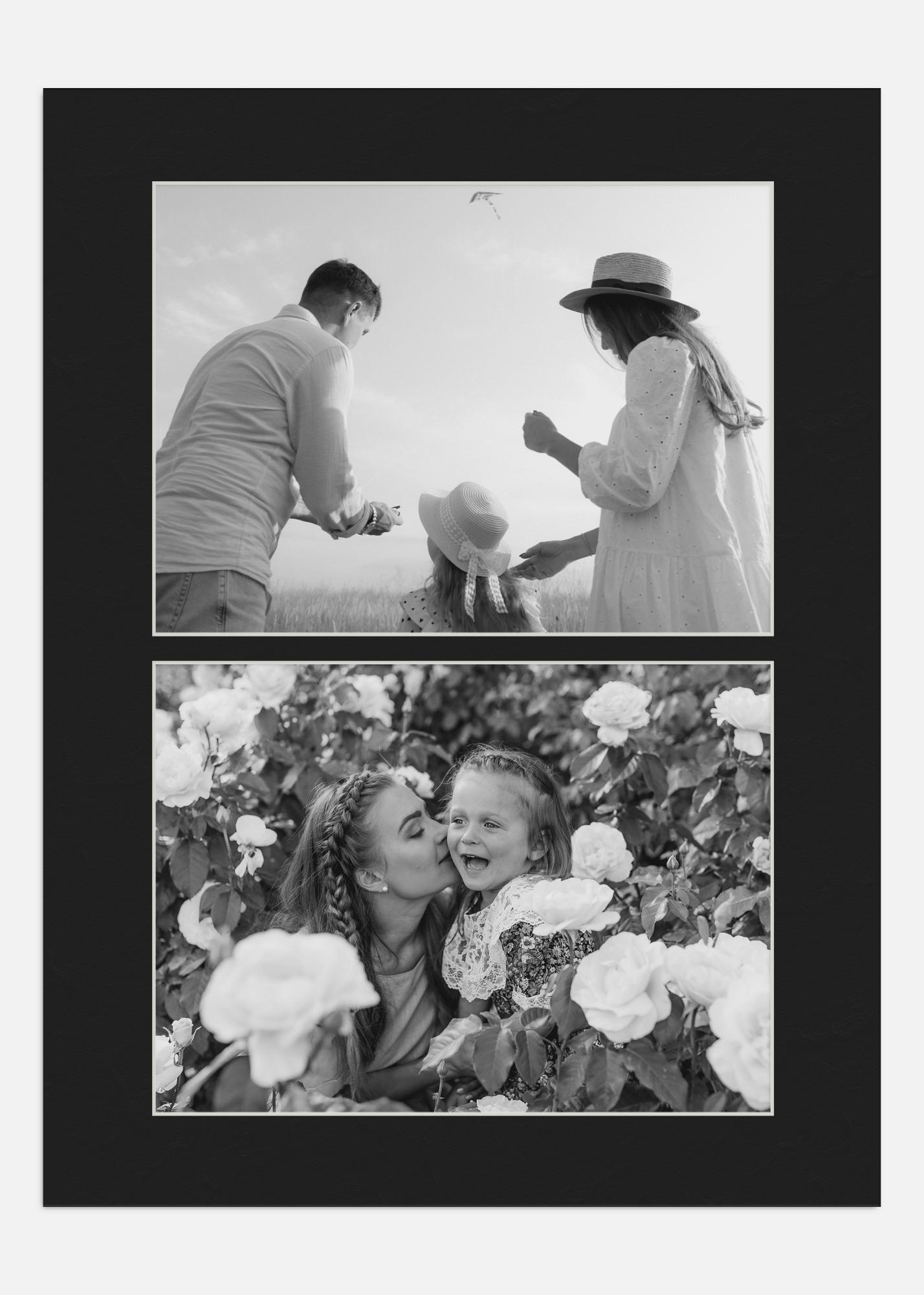 Kislinsko nevtralna črna kolaž paspartu s poševno odrezanimi belimi robovi najvišje kakovosti. V paspartuju je prostor za 2 sliki. Popolno, kadar želite narediti svoj fotokolaž.