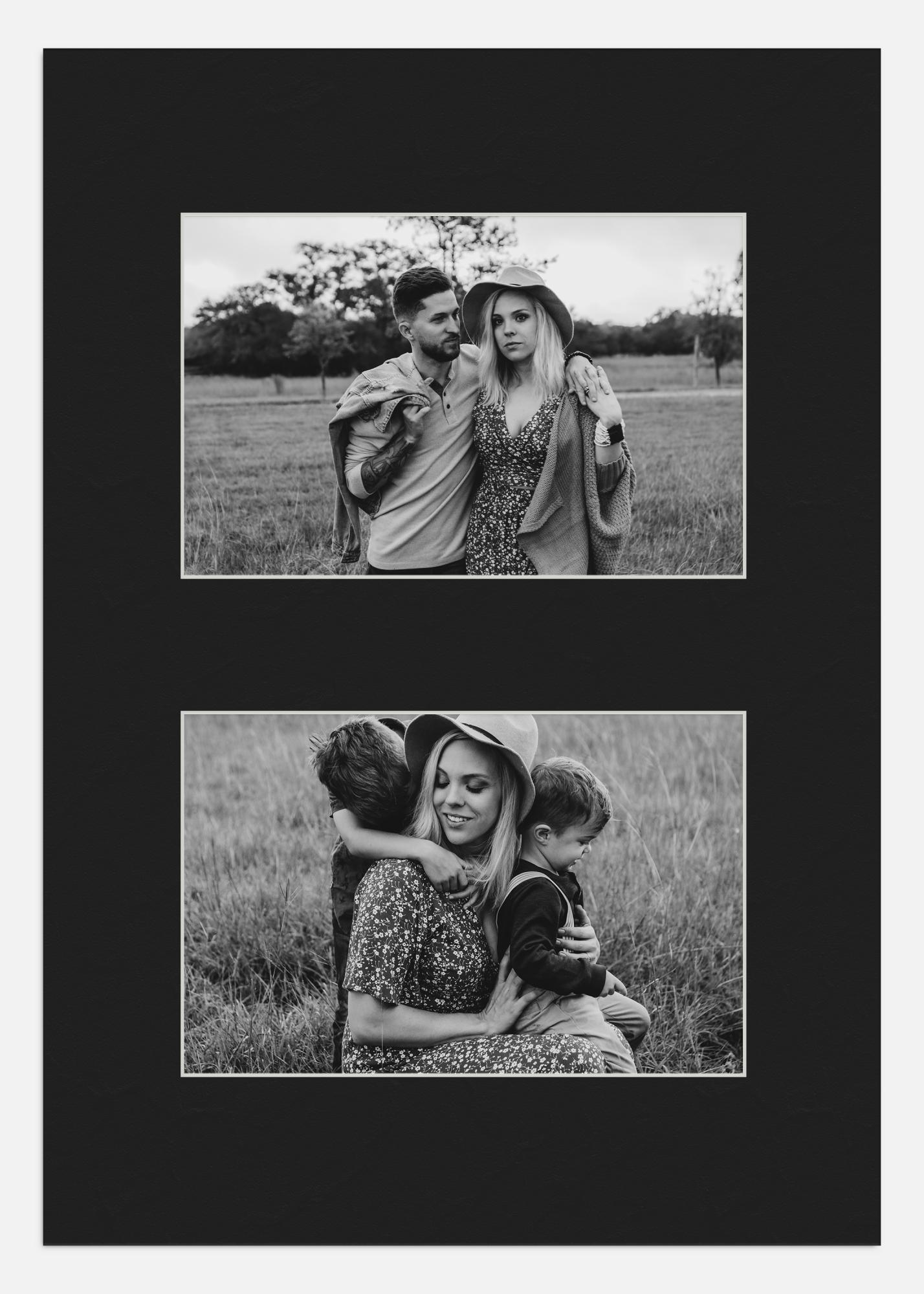 Kislinsko nevtralna črna kolažna paspartura s poševno rezanimi belimi robovi najvišje kakovosti. V pasparturi je prostor za 2 sliki. Popolno, ko želite ustvariti lastni fotografski kolaž.