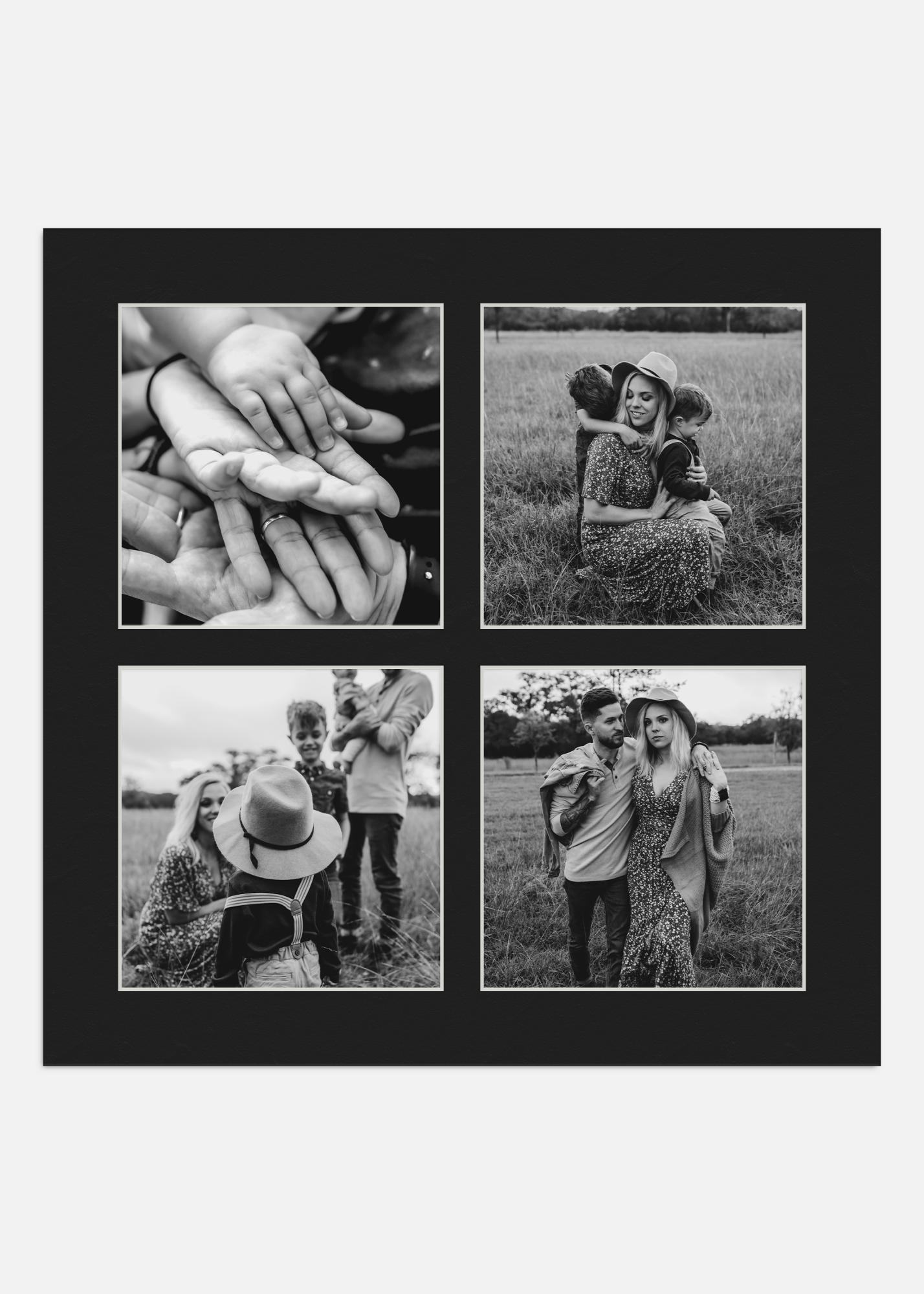 Kisla prost črna kolažni passepartout s poševno odrezanimi belimi robovi najvišje kakovosti. V passepartoutu je prostor za 4 slike. Popolno, ko želite ustvariti svojo osebno fotokolažo.