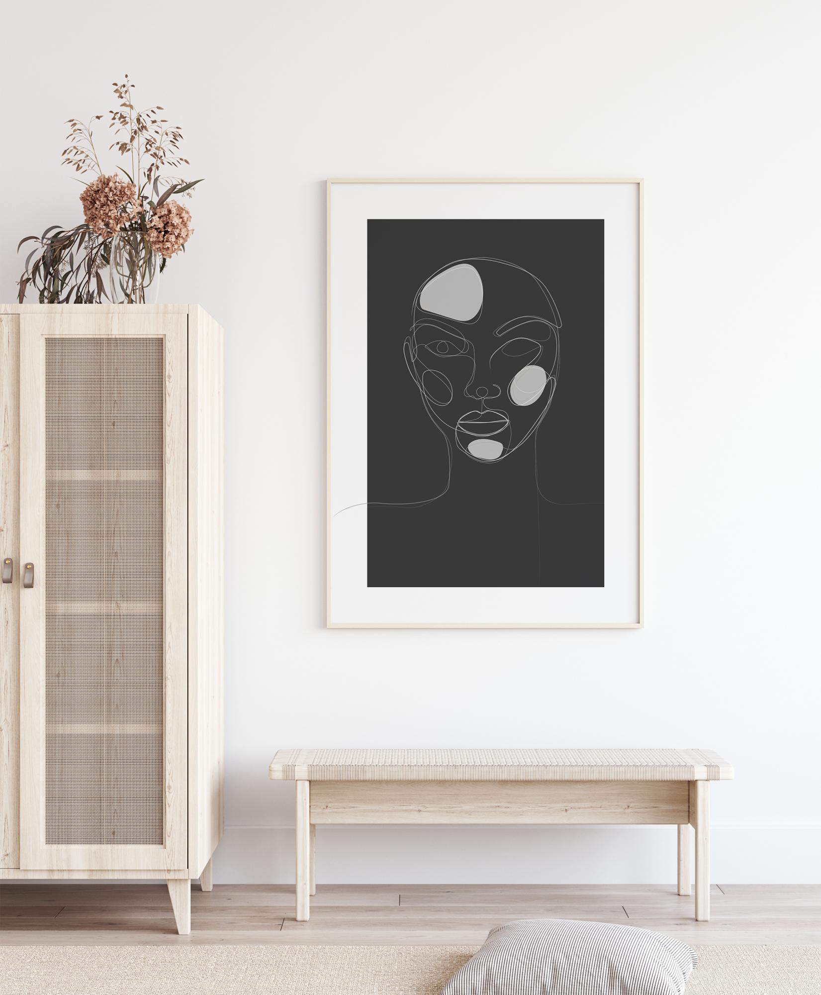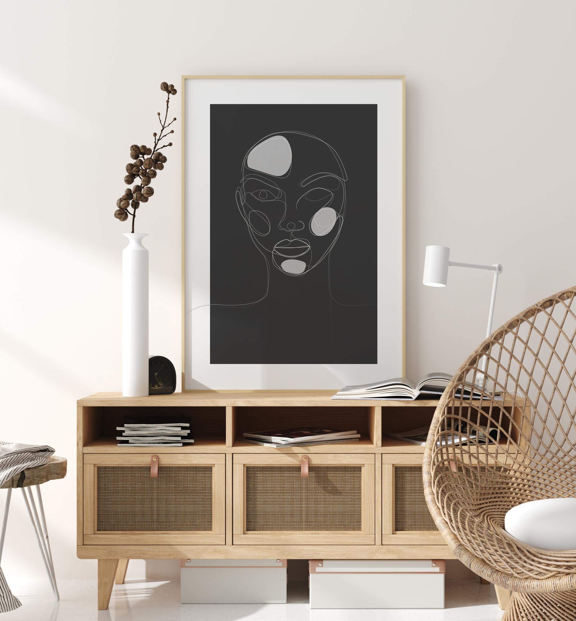 Fantastičen poster ženske glave in ramen, narisan na črni podlagi. Tri bele pike označujejo žensko čelo, lice in brado. Tisk je preprosta linijska risba z vsemi potezami obrobljenimi v beli barvi. Močan tisk za obešanje doma.