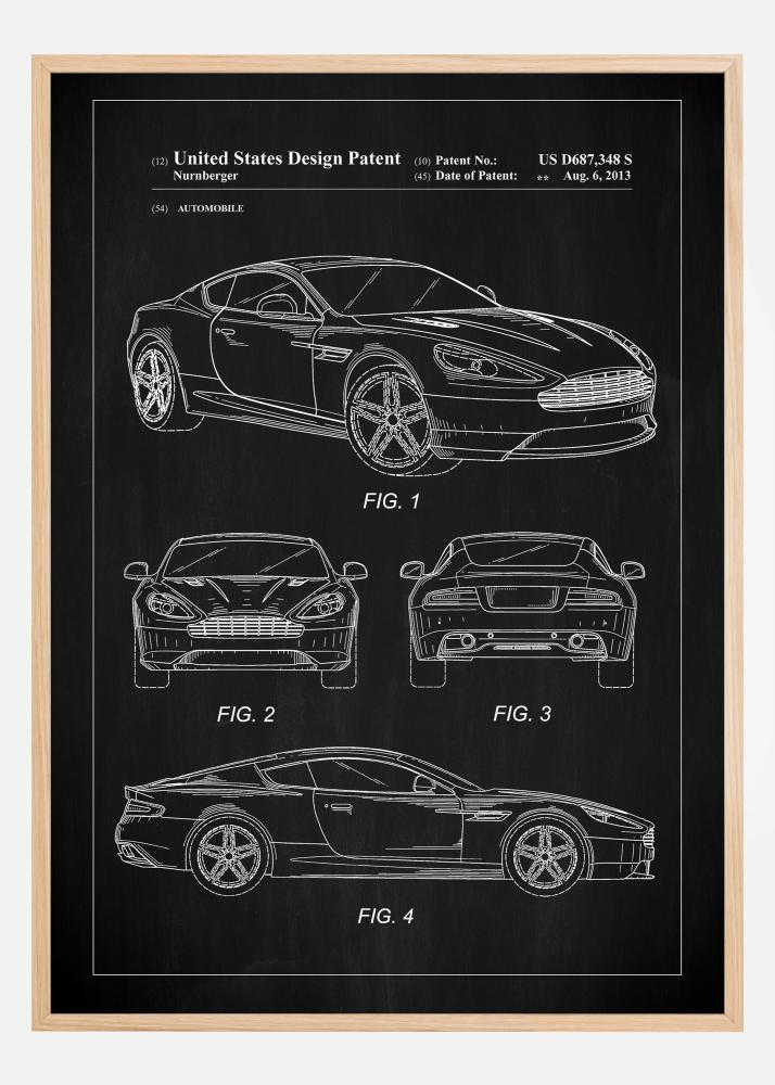 Ta črno-belo patentna plakat prikazuje ekskluzivno zasnovo Aston Martina, registrirano pod ameriško patentno številko US D687,348 S z dne 6. avgusta 2013. Patentni plakat poudarja estetski in funkcionalni preboj v avtomobilski industriji ter je poklon napredku v oblikovanju avtomobilov. Je kreativna podrobnost za vse, ki cenijo tehnično zasnovo, in je obvezna oprema za zbiratelje in tehnološke navdušence.