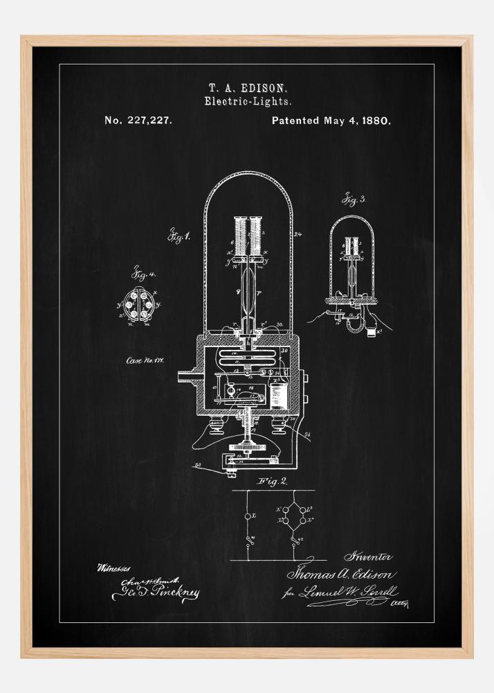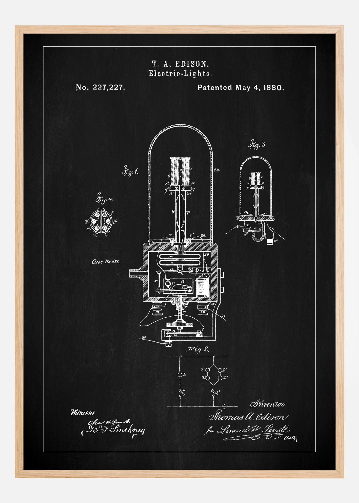Ta edinstvena patentna posterja predstavlja eno izmed najbolj revolucionarnih iznajdb v zgodovini - T.A. Edisonovo električno svetlobo, ki je bila uradno patentirana 4. maja 1880 pod patentno številko 227,227. Motiv je upodobljen v elegantni črno-beli zasnovi in gledalca očara s svojo kompleksnostjo in zgodovinsko vrednostjo. To je čudovit začetek pogovora in stilski dekorativni element, ki se odlično prilega v vsak dom ali pisarno z ljubeznijo do znanosti in dizajna.