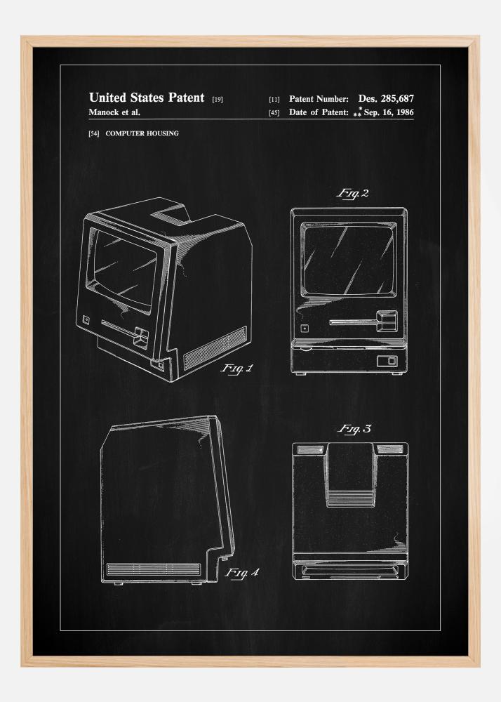 Ta patentna plakata prikazuje zasnovo računalniškega ohišja za Macintosh ali Mac, predstavljeno v ameriškem oblikovalskem patentu Des. 285,687, izdanem 16. septembra 1986. Risba poudarja klasičen slog računalniških ohišij iz srede 1980-ih, obdobje, ko so osebni računalniki začeli postajati pogosti v domovih in pisarnah. Njegova značilna oblika in stil odražata tehnične in estetske ideale tistega časa.