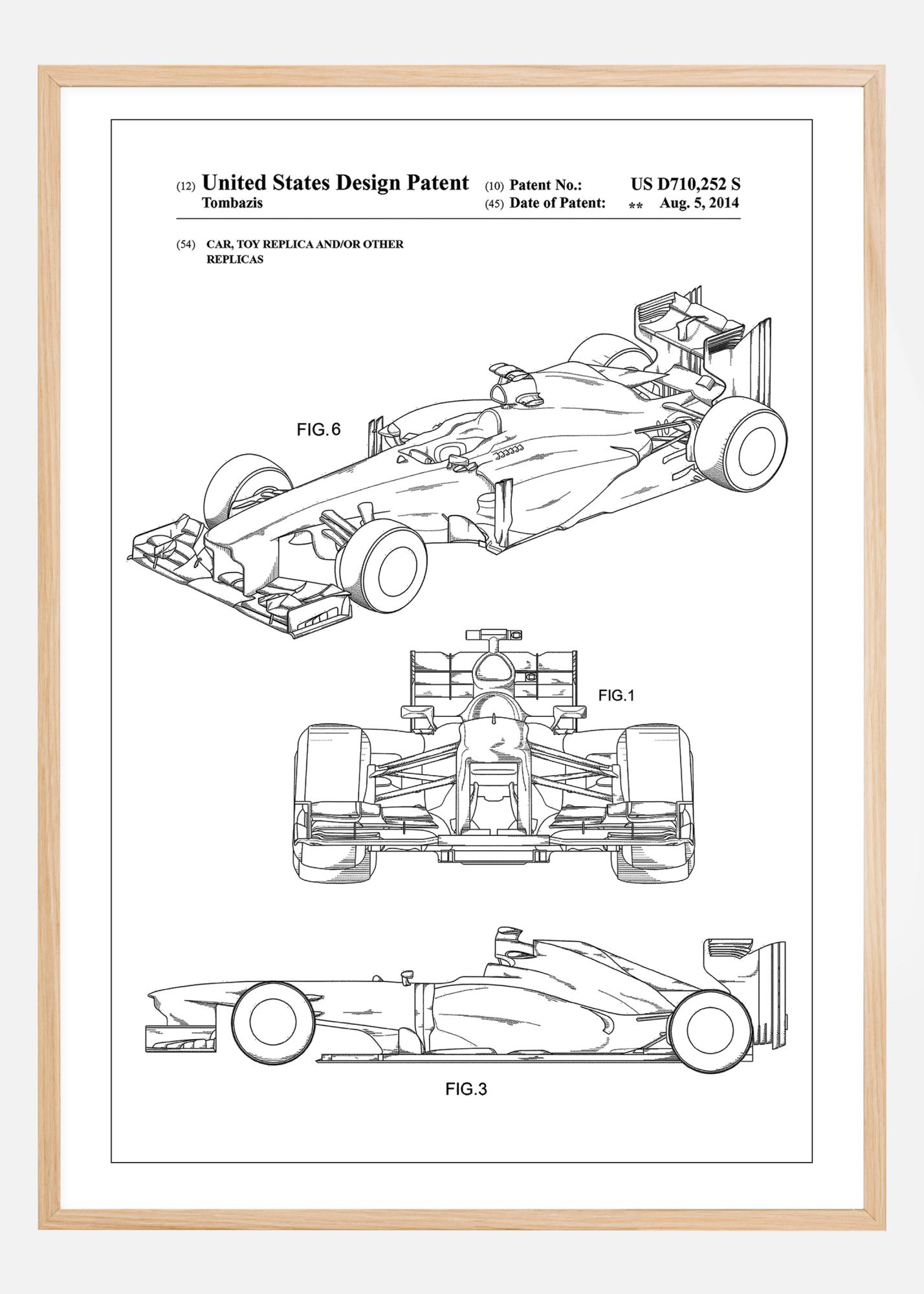 Ta patentna plakat prikazuje dizajn dirkalnega avtomobila, natančneje formule 1, kot je podrobno opisano v ameriškem patentu za dizajn US D710,252 S, izdanem 5. avgusta 2014. Risba prikazuje avto iz več različnih kotov, da ponudi popolno predstavo o njegovi aerodinamični in inovativni zasnovi. Takšna zasnova je ključna v motošportu in prispeva k učinkovitosti in estetiki avtomobila.