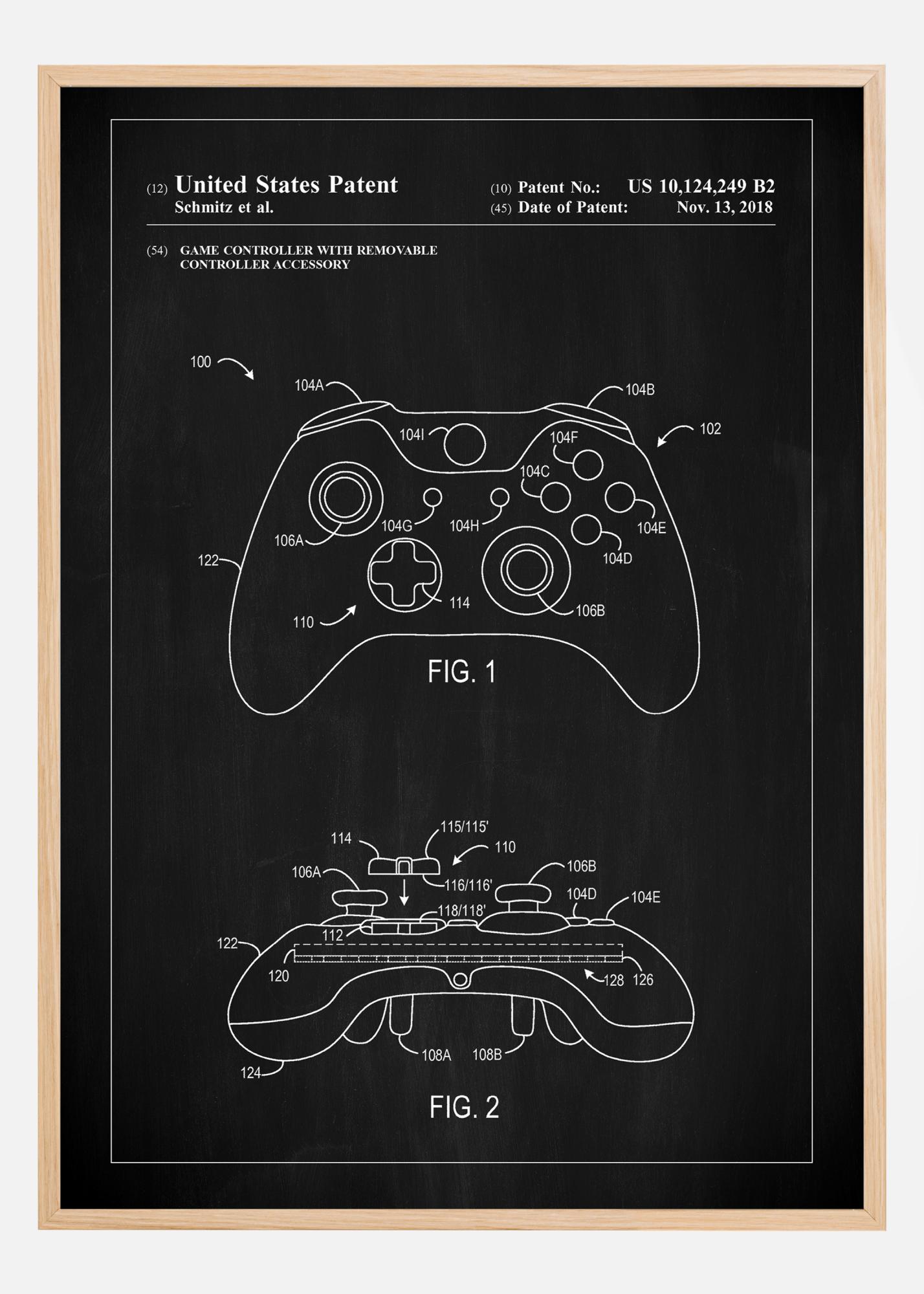 Ta patentna plakat s črnim ozadjem elegantno poudarja sodobni igralni kontroler za Xbox z odstranljivim dodatkom, patentna številka US 10,124,249 B2, z dne 13. novembra 2018. Napredna zasnova in njene komponente so vizualno prikazane v podrobnostih, kar ponuja vpogled v to, kako je mogoče prilagoditi tehnologijo in igralno izkušnjo za uporabnika. To je manifestacija stalnih inovacij, ki potekajo v svetu igralnih kontrolerjev.