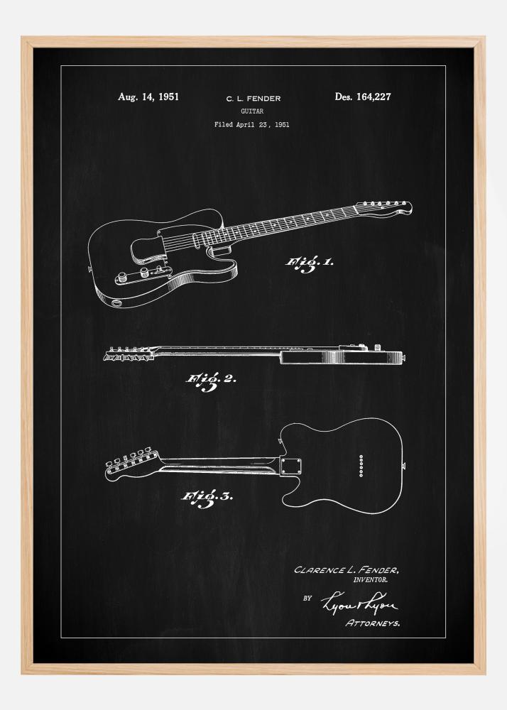 Ta patentna plakat s črno tablo ozadjem ponuja močan vizualni učinek, popoln za poudarjanje dizajna električne kitare Clarencea L. Fenderja, patentna številka 164,227 z dne 14. avgusta 1951. Ikonične konture in podrobnosti kitare ostro izstopajo proti ozadju, kar omogoča čisto in izrazito predstavitev instrumenta iz treh različnih perspektiv.
