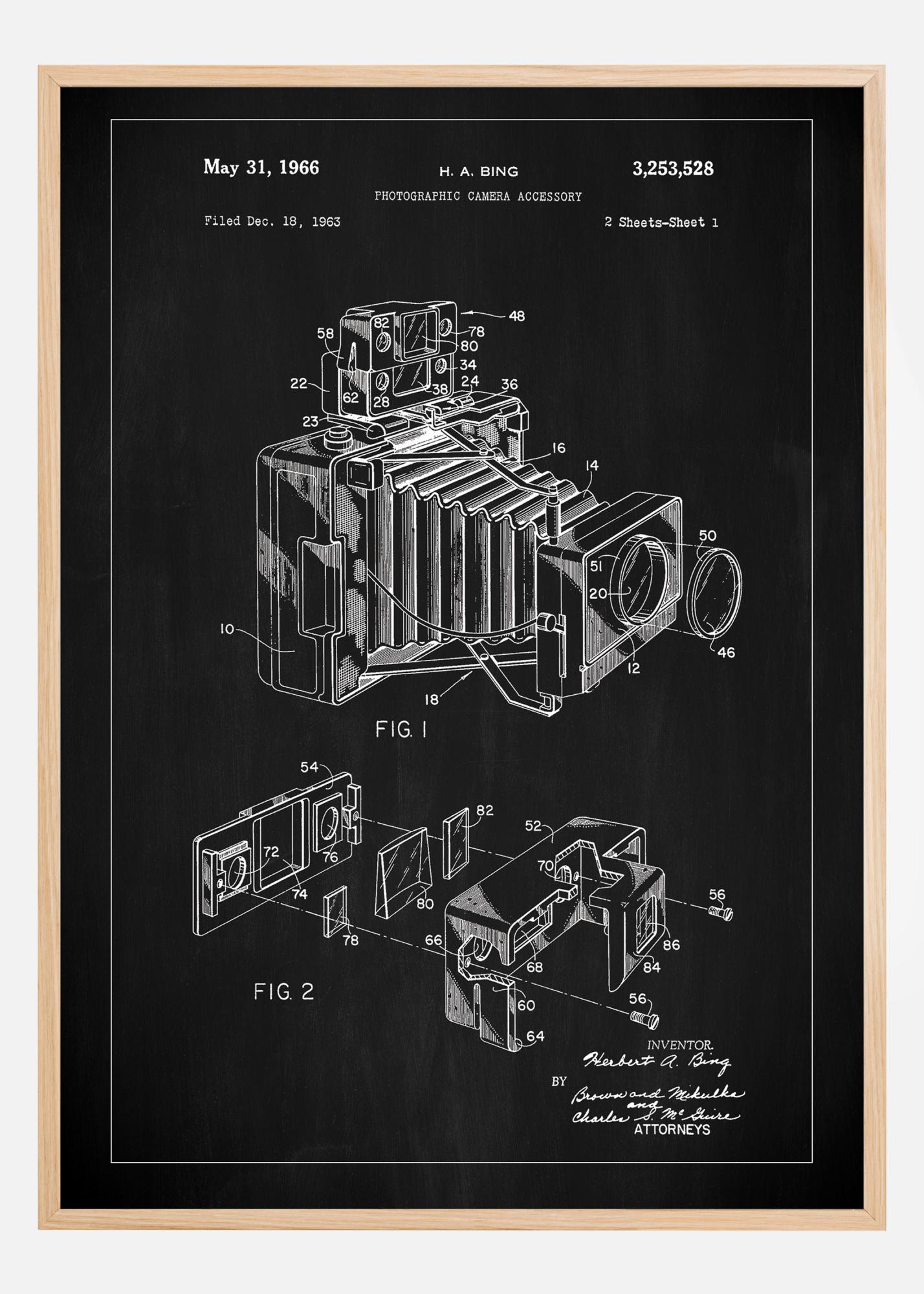 Ta izpopolnjen patentni poster s črno tablo ozadjem ponuja močno in elegantno predstavitev fotografskega kamera dodatka, patent številka 3,253,528, izdanega 31. maja 1966. S svojo ostro belo črto ilustracijo, ki izstopa proti temnemu ozadju, risba ponuja podroben pogled na tehnično inovacijo, ki je premaknila umetnost fotografije naprej. Patentni poster je poklon času, ko je fotografija začela delati velike korake v tehnološkem razvoju.