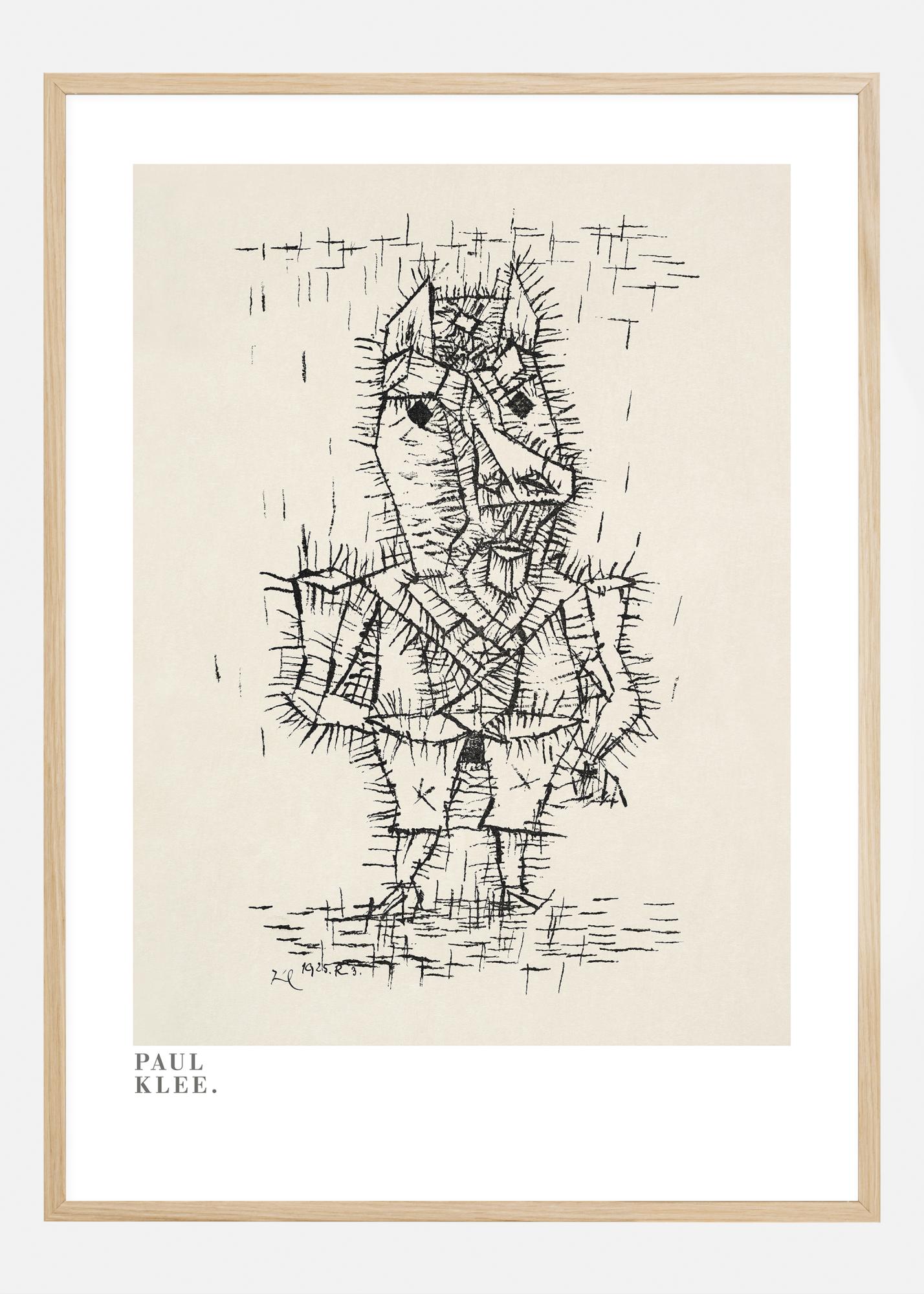 Ta plakat prikazuje fascinantno grafično podobo Paula Kleeja "Ass Esel" iz leta 1925. Predstavlja abstraktno figuro, sestavljeno iz dinamičnih linij in oblik, ki ustvarjajo močan vizualni učinek. Umetnikova igra s teksturo in linijami oživi v tem črno-belem delu, kjer kontrast med drzno črto in mehkim ozadjem ustvarja zanimivo kompozicijo. Ta print je odraz Kleejeve sposobnosti, da preoblikuje preproste konture v izražene in čustveno nabite slike.