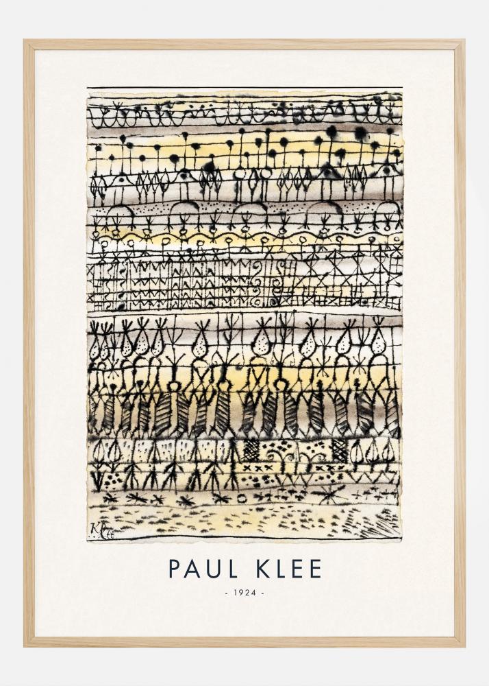 Ta plakat prikazuje delo Paula Kleeja "Cooling in a Garden of the Hot Zone" iz leta 1924, kompleksni vzorec linij in oblik, ki spominja na vrt v abstraktni pokrajini. Na igriv način Klee raziskuje teme narave in strukture z zlaganjem slojev simboličnih in geometrijskih elementov enega na drugega, kar ustvarja ritmično in skoraj glasbeno kompozicijo. Raznolika uporaba vrst linij in kontrastnih barv vdihuje življenje v abstraktni vrt na način, ki je značilen za Kleejevo umetnost.