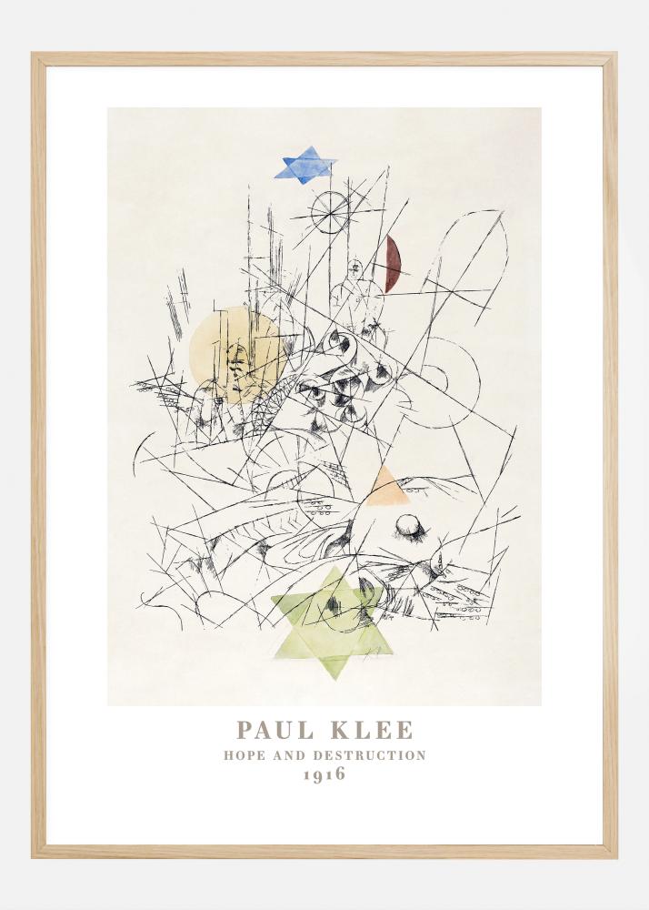 Ta umetniški plakat prikazuje delo Paula Kleeja z naslovom "Upanje in uničenje" iz leta 1916 ter zajema edinstveno kombinacijo abstraktne umetnosti in simbolike, značilne za Kleejev slog. Motiv je bogat z linijami in oblikami, ki medsebojno delujejo po površini kompozicije, kar daje občutek tako reda kot kaosa. To je tisk, ki bi lahko pritegnil tiste, ki cenijo tako moderno kot sodobno umetnost, idealen za dodajanje miselne dimenzije vsakemu prostoru ali pisarni.