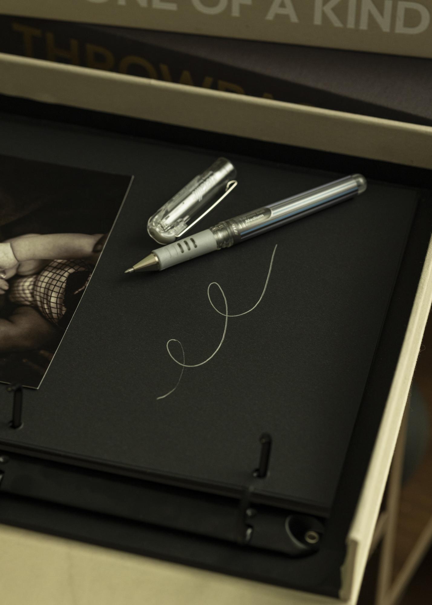 Pisalo iz Pentela z barvo kovinske srebrne. Pisalo ima širino konice 1 mm.