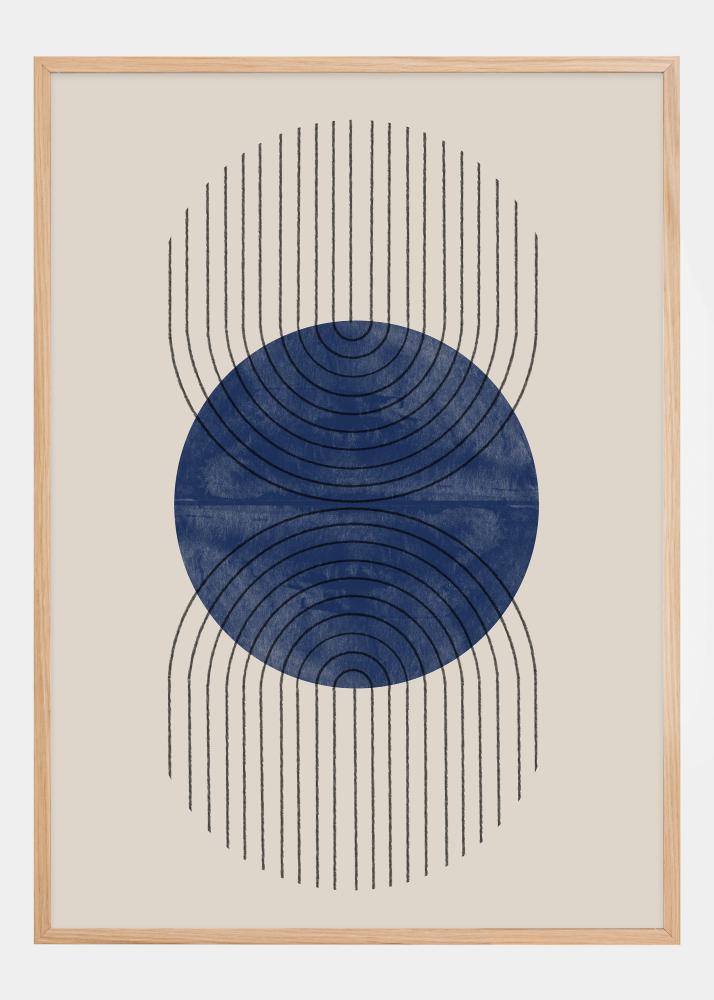 Ta minimalističen in abstrakten plakat prikazuje globoko modro krožno obliko, ki je centrirana znotraj serije vertikalnih linij, ki ustvarjajo iluzijo gibanja in dimenzije. Umetniško delo se poigrava z optično izkušnjo perspektive in globine skozi ponavljajoč vzorec, zaradi česar se zdi, da modri krog pulsira ali vibrira. Skromna barvna lestvica sestavljajo globoko modra proti nevtralnemu ozadju, ki poudarja čiste linije in preprosto lepoto dizajna.