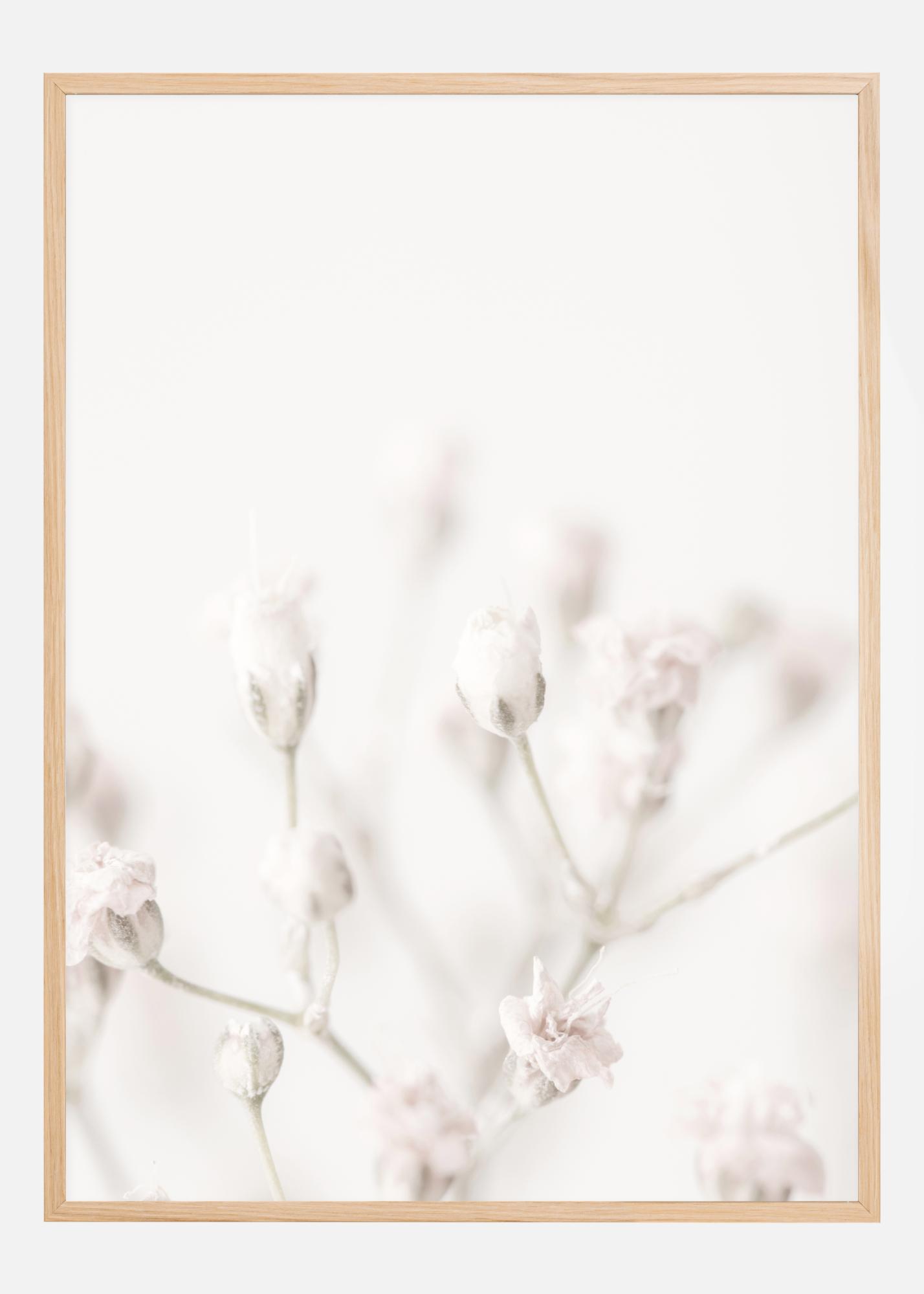 Očarljiv plakat od blizu z majhnimi rožnatimi cvetovi, ki močno prenašajo bel snežni metež. S zamegljenim belim ozadjem so cvetovi vidni le rahlo zaradi svojih nežnih rožnatih cvetnih listov. Prinesite zimsko pokrajino v svoj dom s to čudovito sliko.
