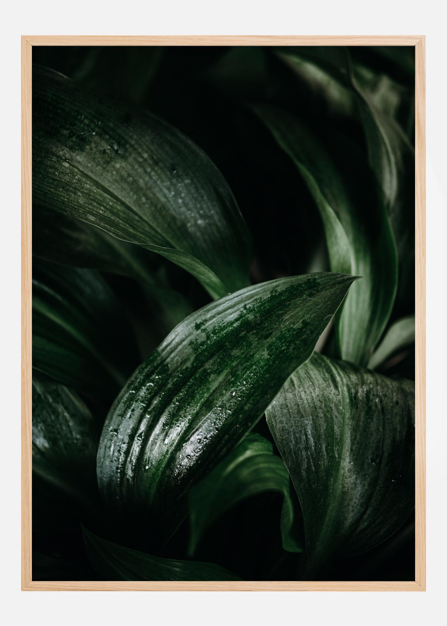 Približan posnetek mokrih listov, ki tesno skupaj pokrivajo poster. Kapljice vode na listih ustvarjajo bleščečo atmosfero. Temno, zamegljeno ozadje prikazuje druge liste, ki se trudijo biti vidni. Ta dovršena lepota je popolna za vaš dom.