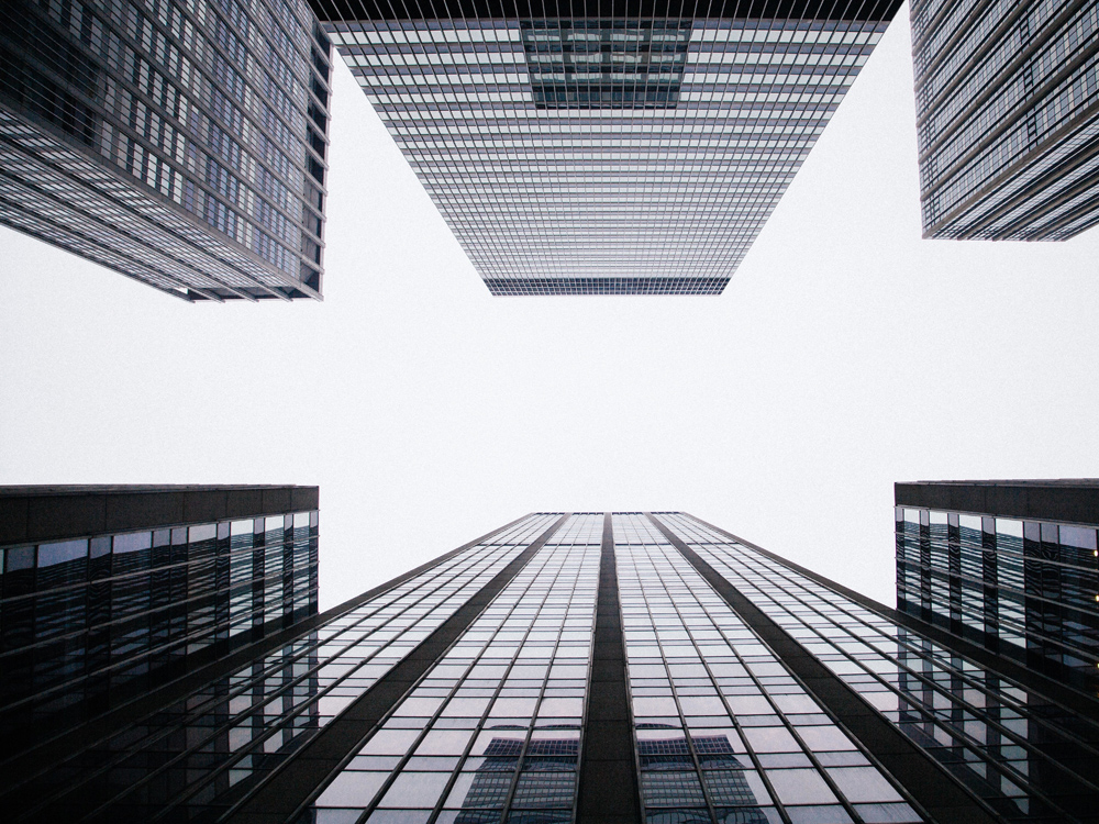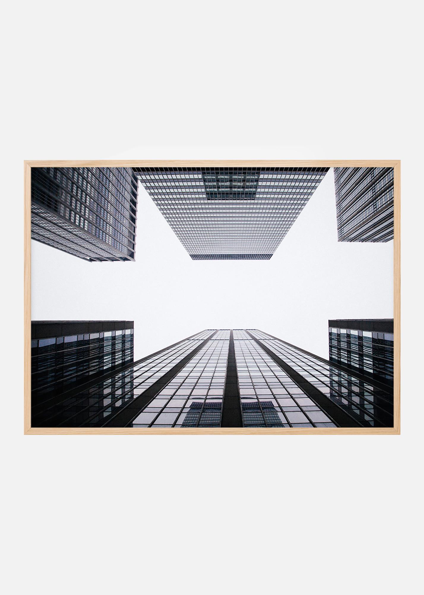 Arhitekturni plakat z rastočimi nebotičniki proti oblačno beli nebu. Eleganten posnetek temnih stavb na belem ozadju, z odsevi neba v steklenih oknih. Popolno darilo za tiste, ki imajo radi grafične portrete zgradb. Tisk je videti odlično v črnem okviru, ki poudari temne dele slike in se lepo ujema z drugimi fotografijami arhitekture.