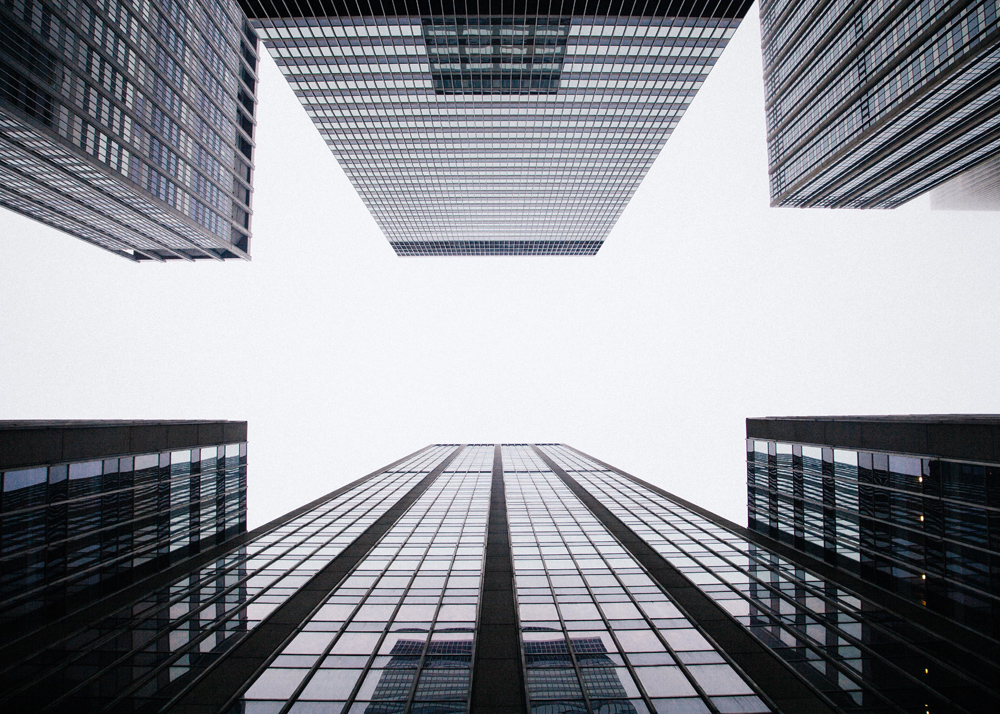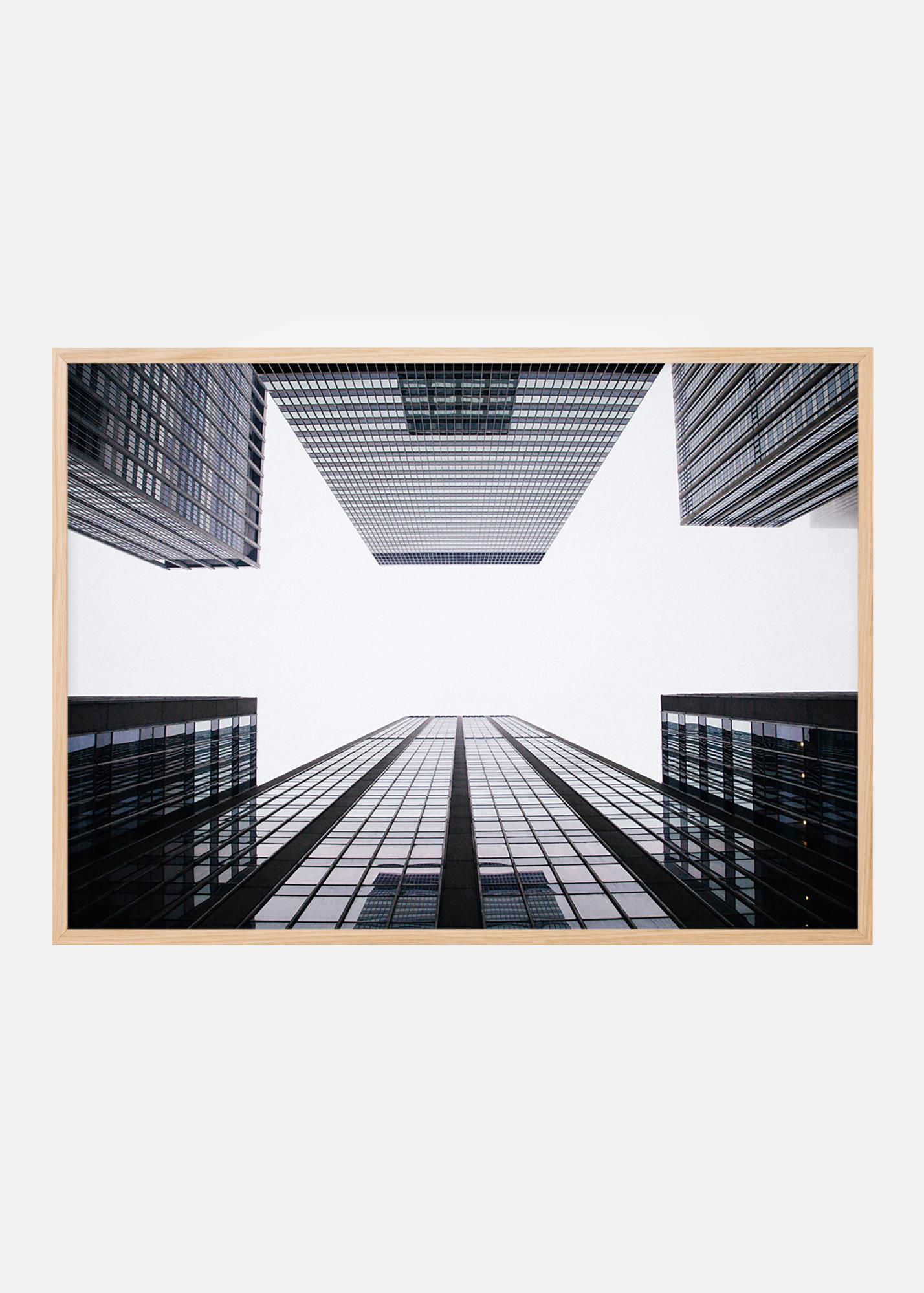 Arhitekturni plakat z rastočimi nebotičniki proti oblačno belemu nebu. Elegantna slika temnih stavb na belem ozadju, z odsevi neba v steklenih oknih. Popolno darilo za tistega, ki ima rad grafične portrete stavb. Tisk lepo izstopa v črnem okvirju, ki poudarja temne dele slike in se lepo ujema z drugimi fotografijami arhitekture.