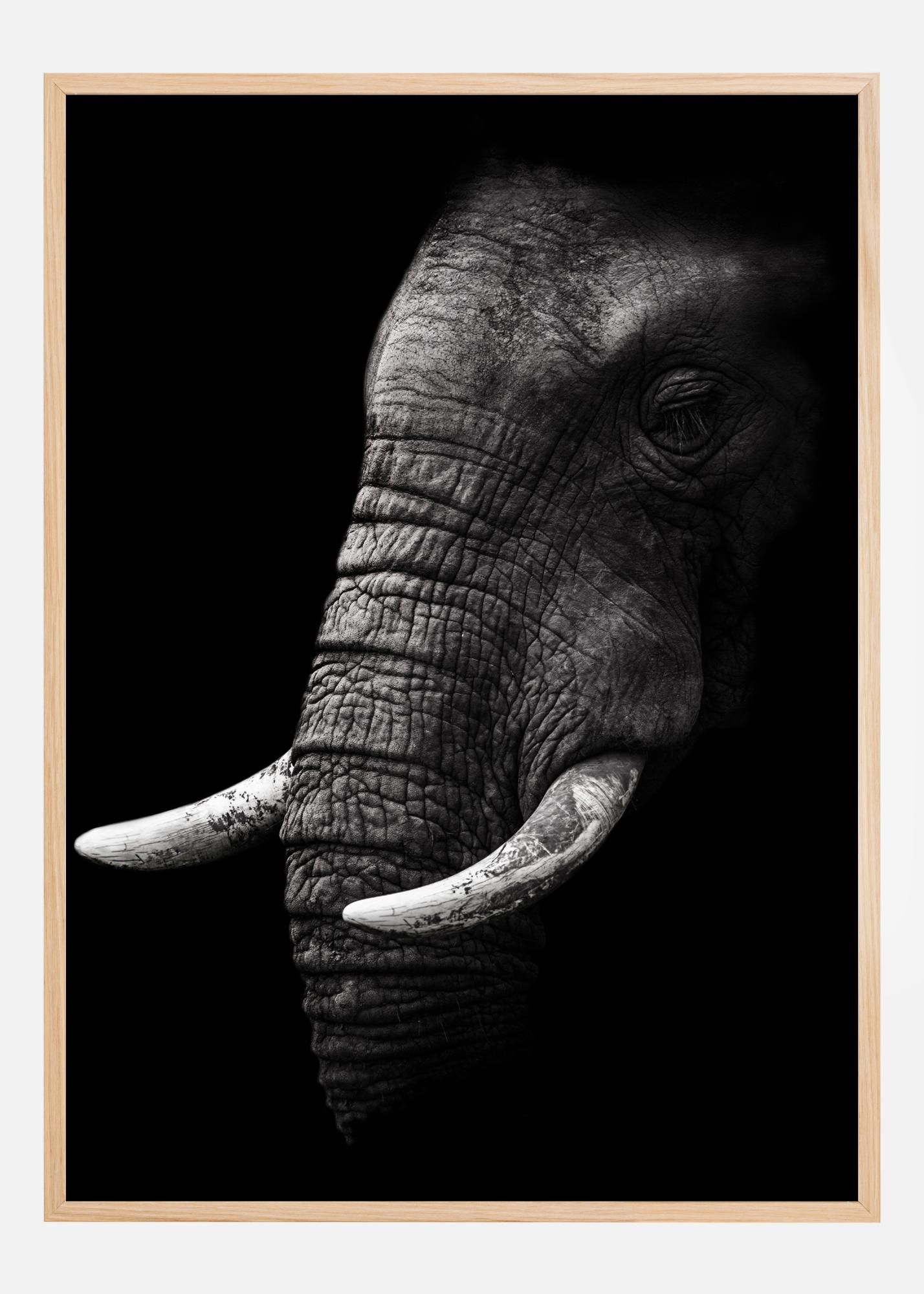 Čudovit črno-bel tisk glave slona. Črno ozadje poudari majhne slonove čekane. S svojim majhnim gubastim rilcem in zaprtimi očmi je slika elegantna predstavitev slonove lepote. Idealni poster za ljubitelje živali.