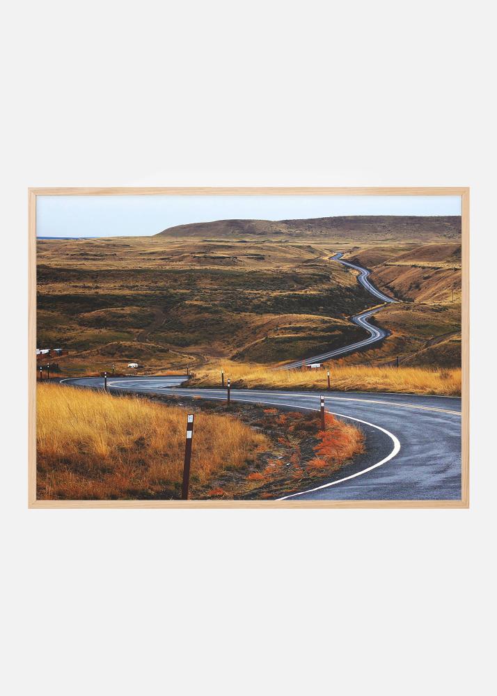 Poster z asfaltno cesto, ki se vije skozi sončno ožgano stepsko pokrajino. Rumeno-rjavi odtenki trave proti hladni površini asfalta, ki se prebija skozi odprto pokrajino, pritegnejo pogled v sliko in sledijo cesti. Plakat se dobro prilega v minimalistični okvir, kjer motiv pride do izraza, in ga lahko kombiniramo z drugimi slikami za temo.