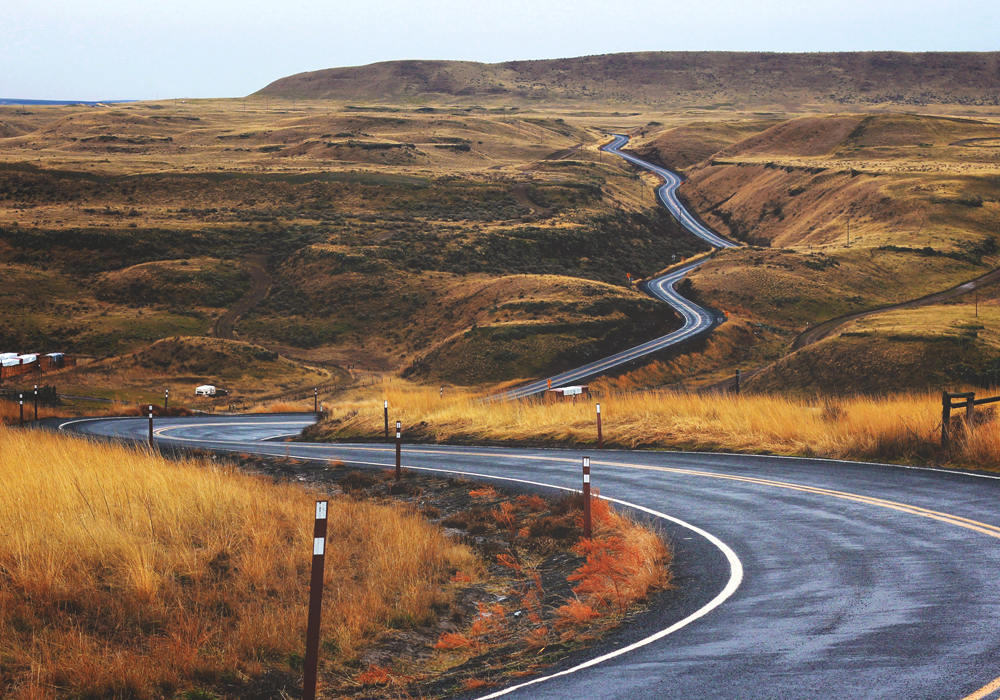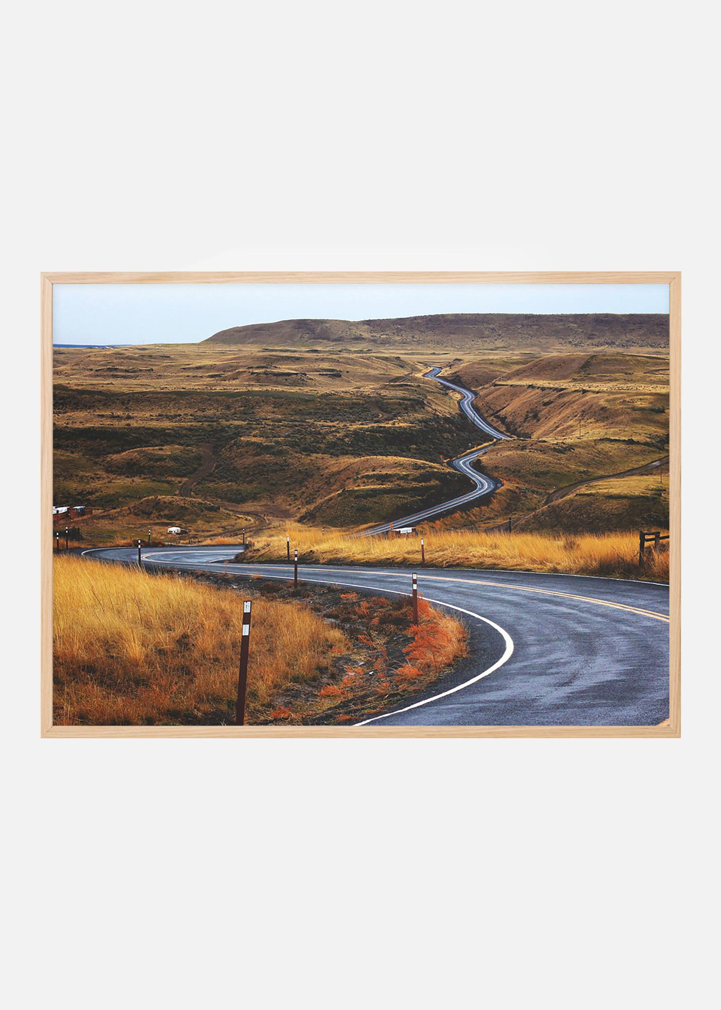 Plakat s asfaltirano cesto, ki se vijugasto premika skozi sončno zažgano stepsko pokrajino. Rumeno-rjavi odtenki trave proti hladni površini asfalta, ki se prebija skozi odprto pokrajino, pritegnejo pogled v sliko in sledijo cesti. Plakat se dobro ujema v minimalističnem okvirju, kjer motiv pride do izraza, in ga je mogoče kombinirati z drugimi slikami za ustvarjanje teme.