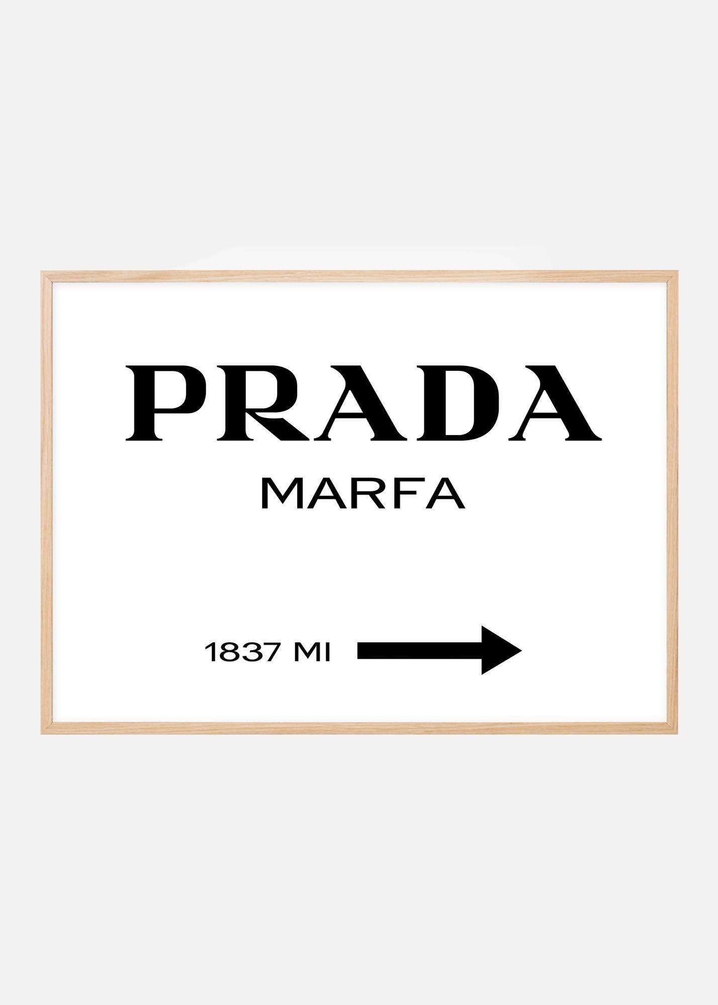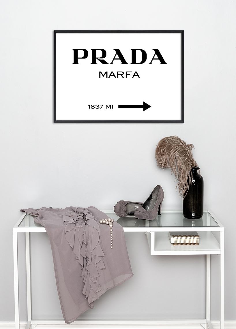 Poster s kažipotom do stalne umetniške inštalacije Prada Marfa, ki sta jo ustvarila umetnika Elmgreen in Dragset. Instalacija je bila otvorjena prvega oktobra 2005 in naj bi spominjala na trgovino Prada. Črno-beli tisk je primeren tako za dom ljubitelja umetnosti kot tudi za tistega, ki obožuje modni svet, in ga je priporočljivo obesiti skupaj z drugimi plakati z grafičnimi motivi. Dopolnite ga s preprostim črnim ali belim okvirom za fotografije, ki omogoča, da besedilo izstopa in se prilega večini okolij.