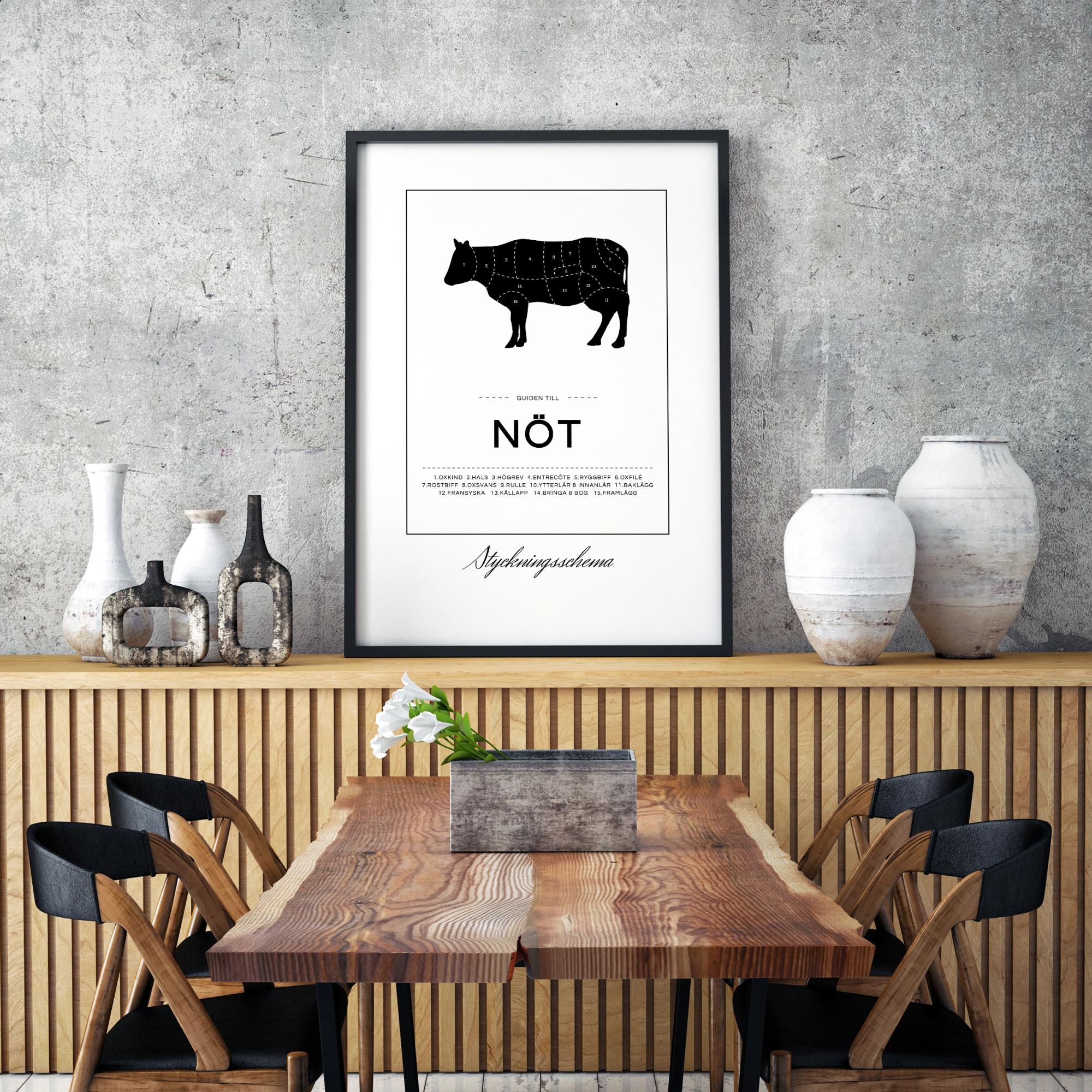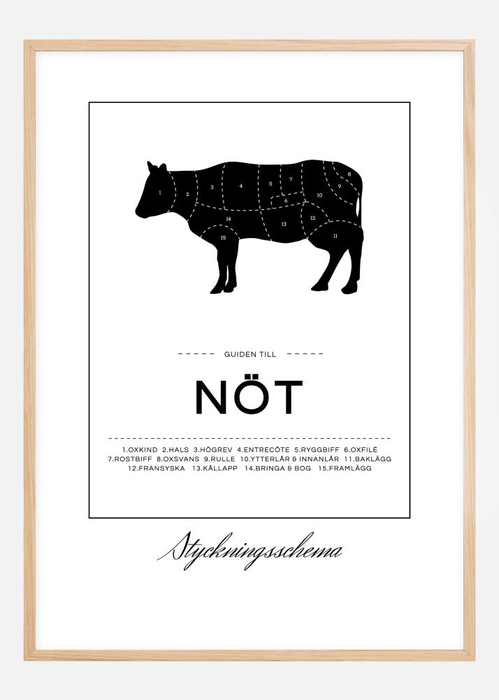 Razdelilna shema ni namenjena le profesionalnim mesarjem! Ta eleganten plakat ima motiv, ki prikazuje črno kravo, razdeljeno na oznake, ki kažejo, kje se na primer nahajajo rostbif, rolada in pečenka. Pod sliko je besedilo "Vodič po govedini" skupaj z urejenim seznamom številk različnih delov. Okoli motiva poteka tanek pravokotnik, pod pravokotnikom pa je natisnjeno besedilo "Razdelilna shema". Črno-bela zasnova se odlično ujema s srebrnim okvirjem ali okvirjem v vaši najljubši barvi. Plakat je na voljo v več različnih velikostih, tako da zlahka najdete tistega, ki ustreza vaši kuhinji.